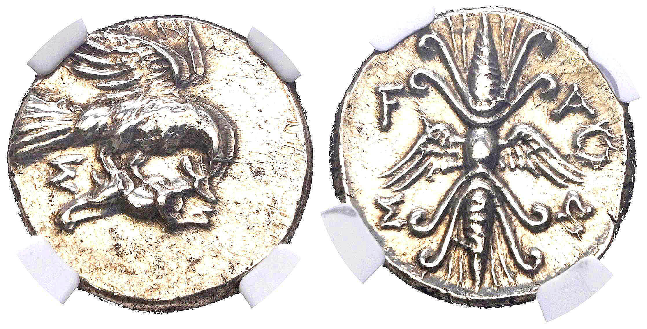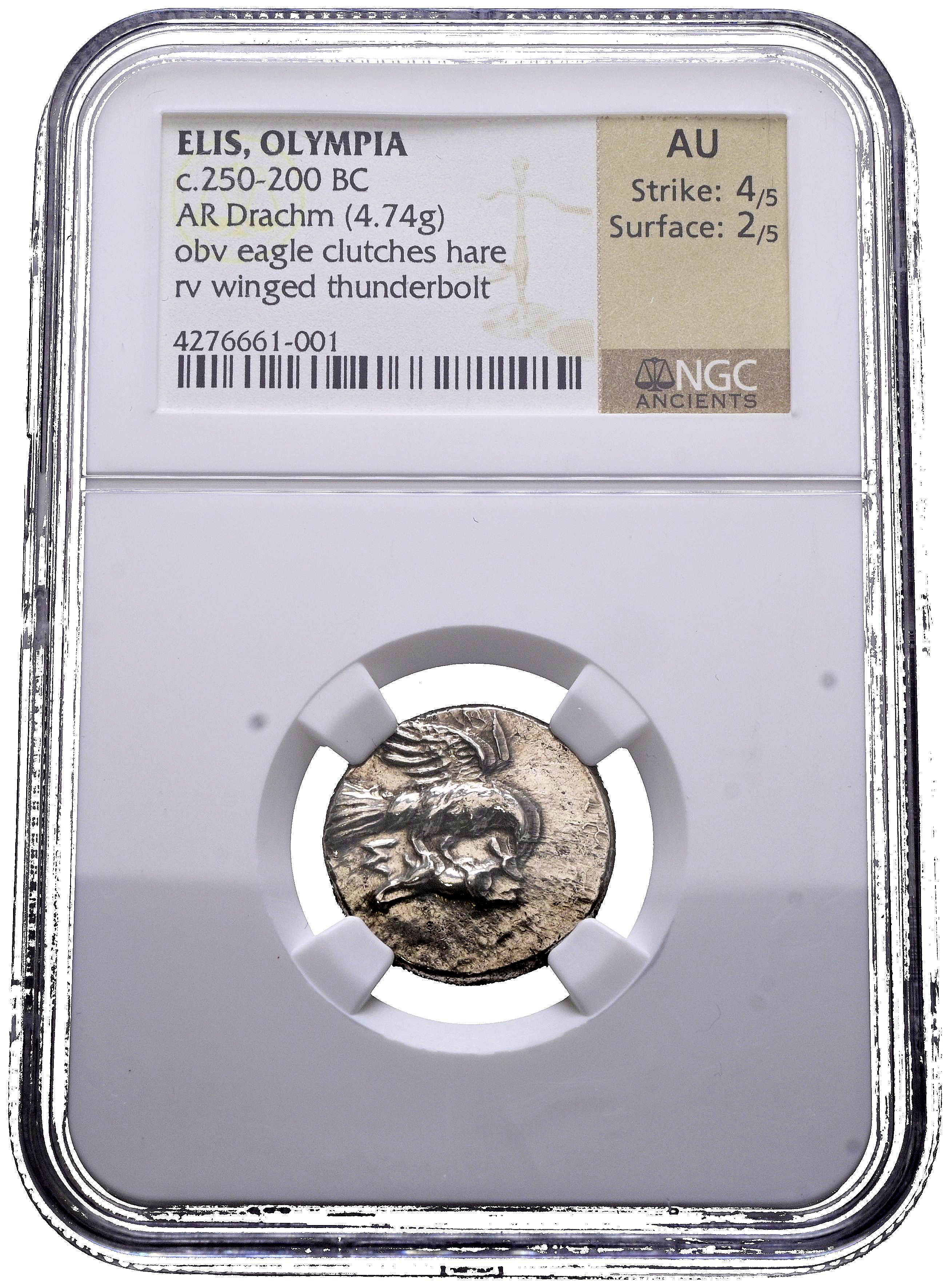 ELIS, Olimpia. Dracma. (Ar. 4,74g/16mm). 250-200 a.C. (HGC 6, 510). Anv: Aguila volando a derecha con presa en sus garras, en campo: Σ. Rev: Rayo alado, en campo: corona de laurel, entre: F-A/Σ-Ω. Encapsulado por NGC AU, Strike: 4/5 - Surface: 2/5.
