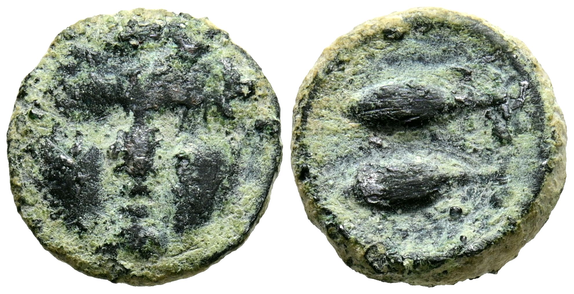 GADES (Cádiz). 1/2 Calco. (Ae. 1,98g/13mm). 200-100 a.C. (FAB-1333). Anv: Cabeza de Melkart de frente con piel de león. Rev: Dos atunes a izquierda. MBC-.