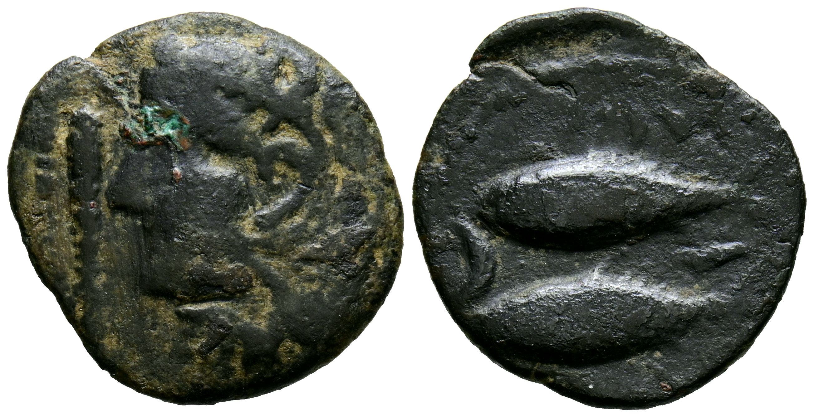 GADES (Cádiz). Semis. (Ae. 2,26g/19mm). 100-20 aC (FAB-1347). Anv.: Cabeza de Hércules con piel de león izquierda, delante clava. Rev: Dos atunes a la izquierda, entre ellos creciente con punto y letra púnica alef, entre ambos leyenda púnica. MBC-.