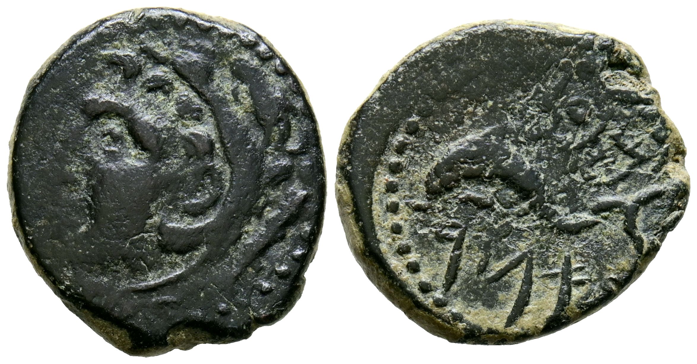GADES (Cádiz). Cuadrante. (Ae. 2,93g/17mm). 100-20 a.C. (FAB-1356). Anv: Cabeza de Hércules con piel de león a izquierda, detrás clava. Rev: Delfín a izquierda con tridente entre leyenda púnica. MBC.