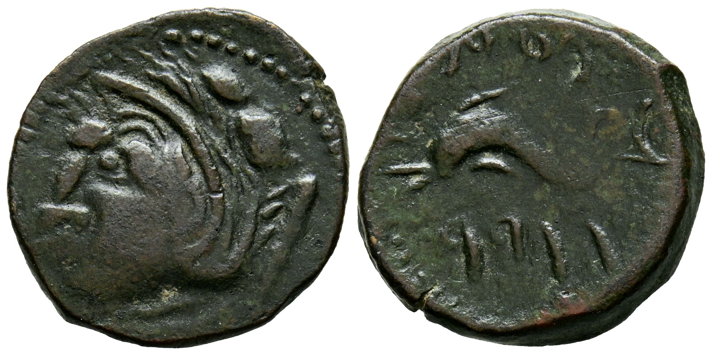 GADES (Cádiz). Cuadrante. (Ae. 2,87g/17mm). 100-20 a.C. (FAB-1356). Anv: Cabeza de Hércules con piel de león a izquierda, detrás clava. Rev: Delfín a izquierda con tridente entre leyenda púnica. MBC.