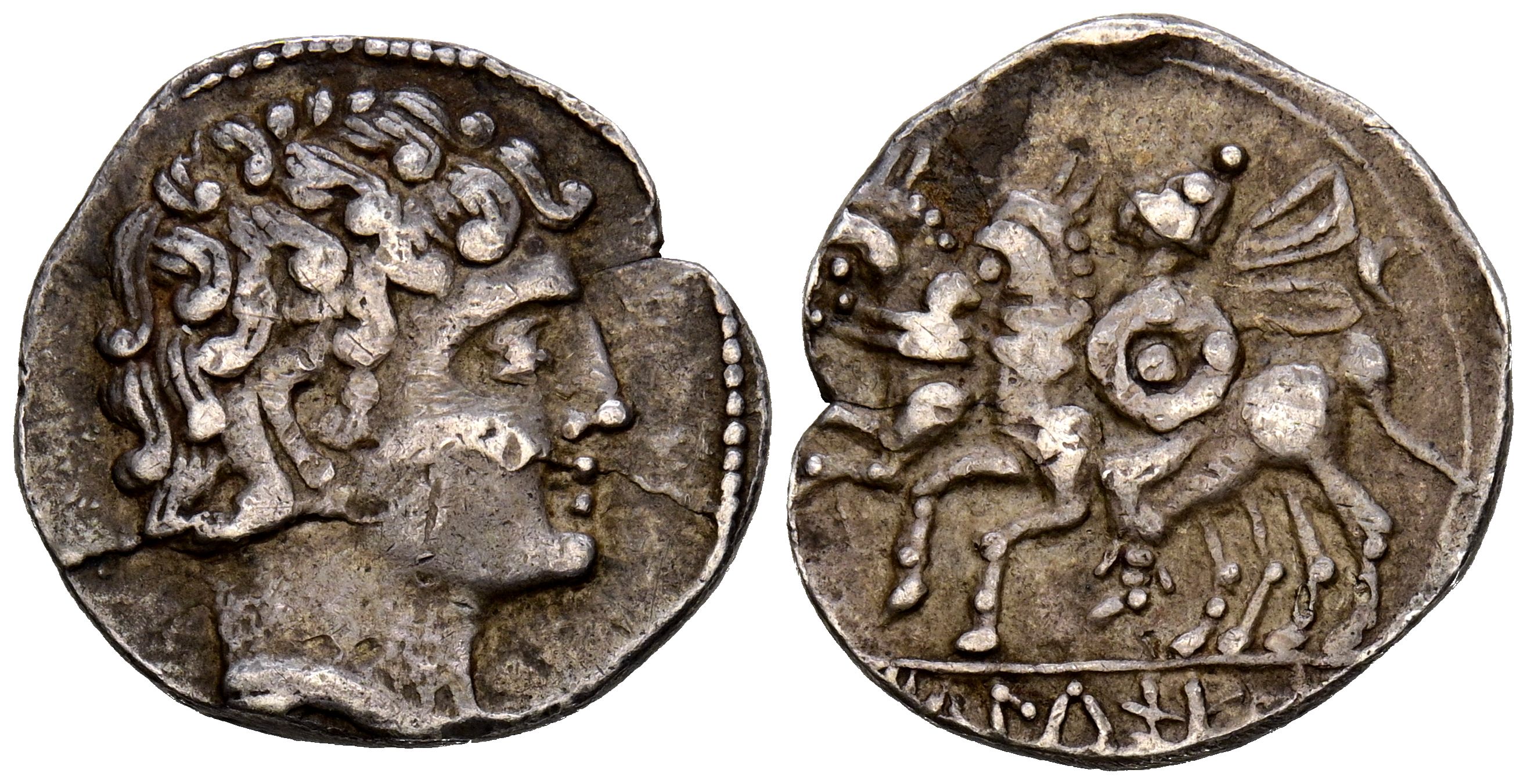 ICALCUSCEN (Iniesta, Cuenca). Denario. (Ar. 3,78g/18mm). 120-20 a.C. (FAB-1396). Anv: Cabeza masculina a derecha. Rev: Jinete con lanza y escudo sobre dos caballos a izquierda, debajo leyenda ibérica bajo línea: ICaLCuSCeN. MBC.