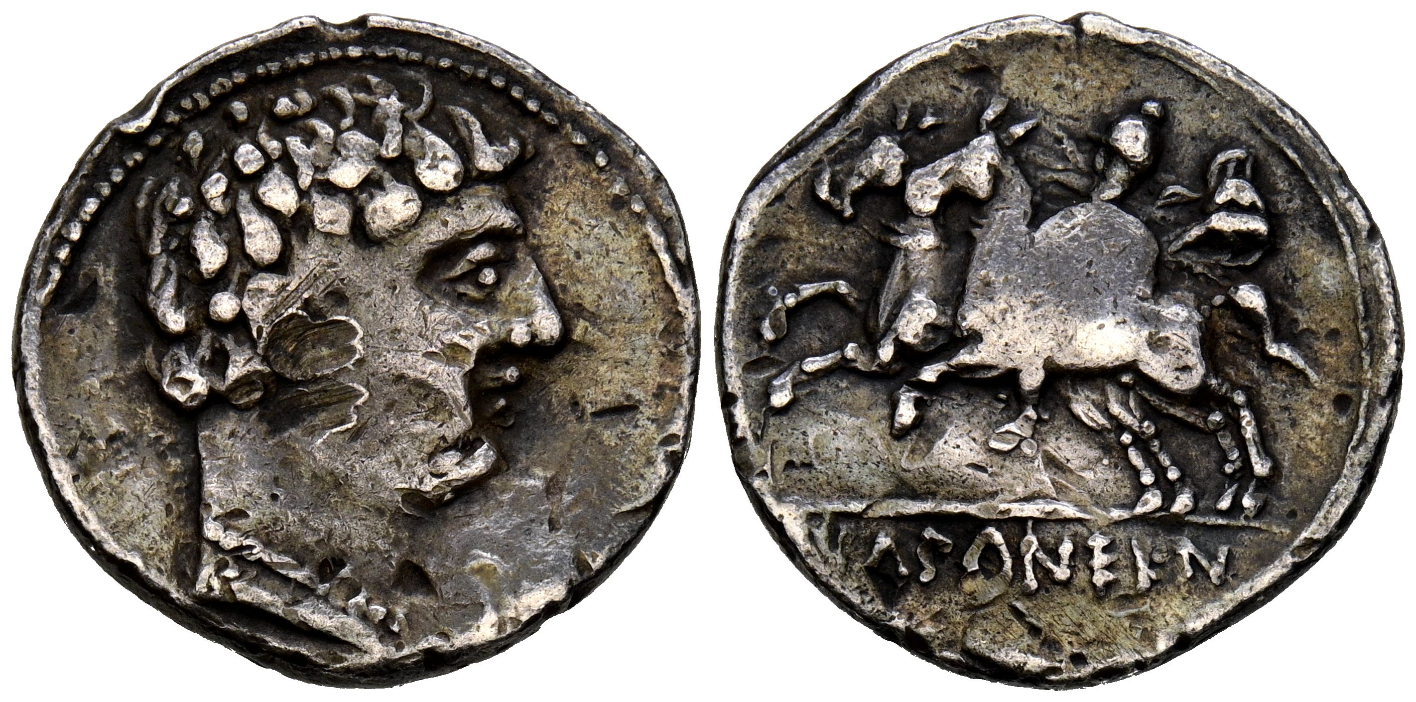 ICALCUSCEN (Iniesta, Cuenca). Denario. (Ar. 3,91g/20mm). 120-20 a.C. (FAB-1396). Anv: Cabeza masculina a derecha. Rev: Jinete con lanza y escudo sobre dos caballos a izquierda, debajo leyenda ibérica bajo línea: ICaLCuSCeN. MBC-. Golpes muy fuertes.