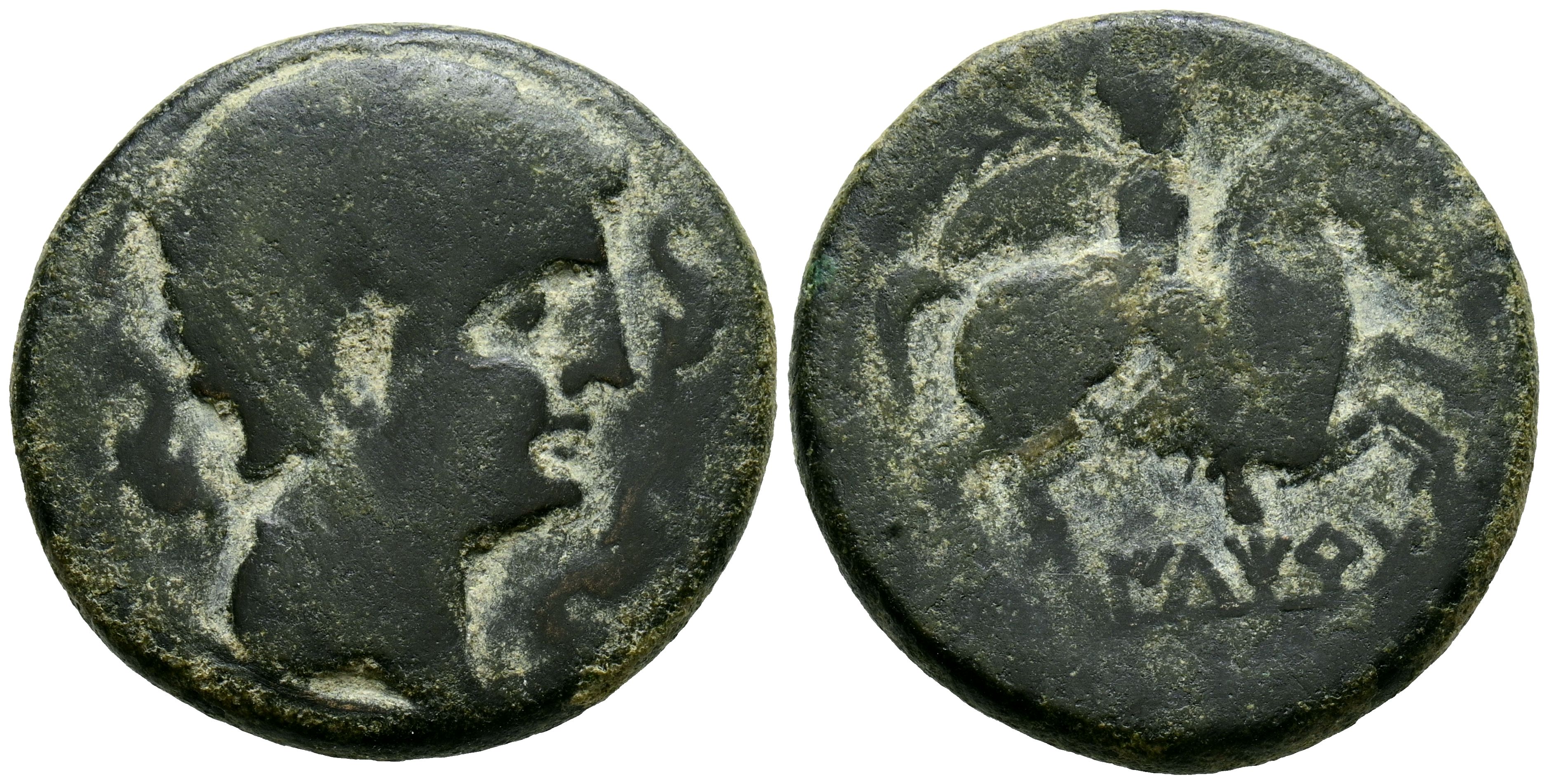 ILTIRTA (Lérida). As. (Ae. 13,63g/27mm). 200-20 a.C. (FAB-1465). Anv: Cabeza masculina rodeada de tres delfines a derecha. Rev: Jinete con palma y clámide a derecha, debajo leyenda ibérica: ILTiRTa. BC+.