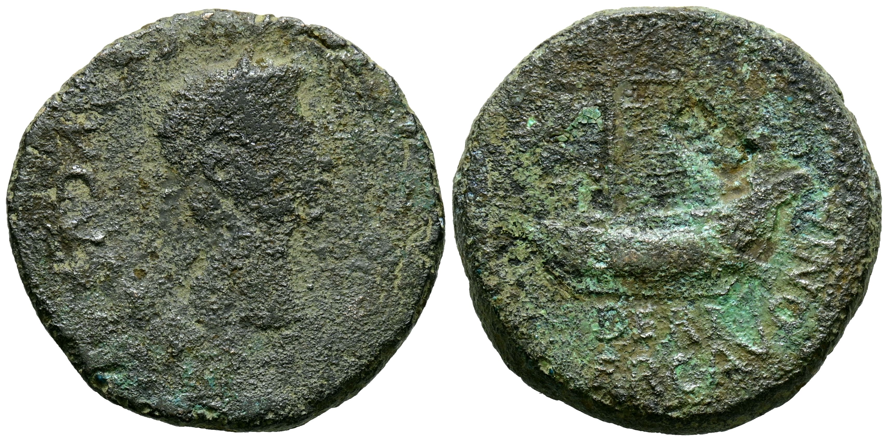 ILERGAVONIA (Tortosa, Tarragona). As. (Ae. 8,11g/24mm). 14-36 d.C. (FAB-1493). Anv: Cabeza laureada de Tiberio a derecha, alrededor leyenda: TI CAESAR DIVI AVG AVGVSTVS. Rev: Nave, debajo: DERT/ILRECAVONIA. BC-/BC. Escaso ejemplar.