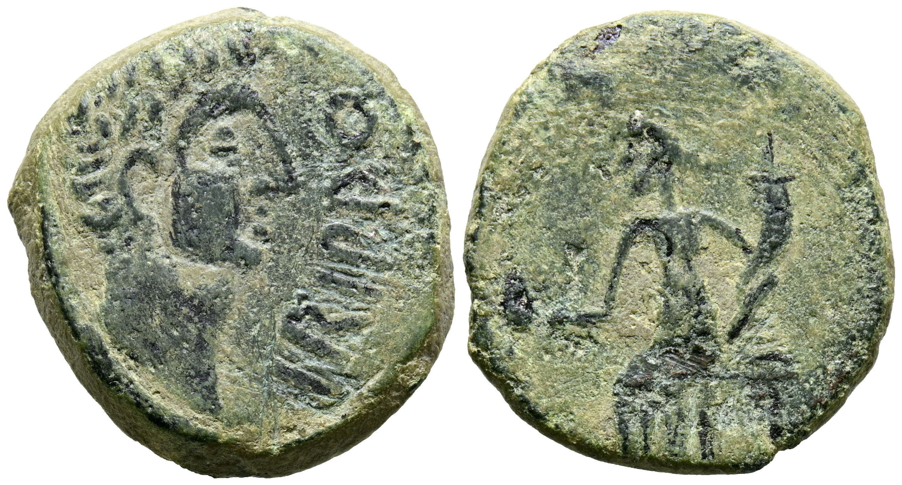 IRIPPO (Zona sur de Sevilla). Semis. (Ae. 7,23g/22mm). 30 a.C. (FAB-1581). Anv: Cabeza masculina a derecha, delante: IRIPPO. Rev: Figura femenina sentada a izquierda con piña y cornucopia. MBC.