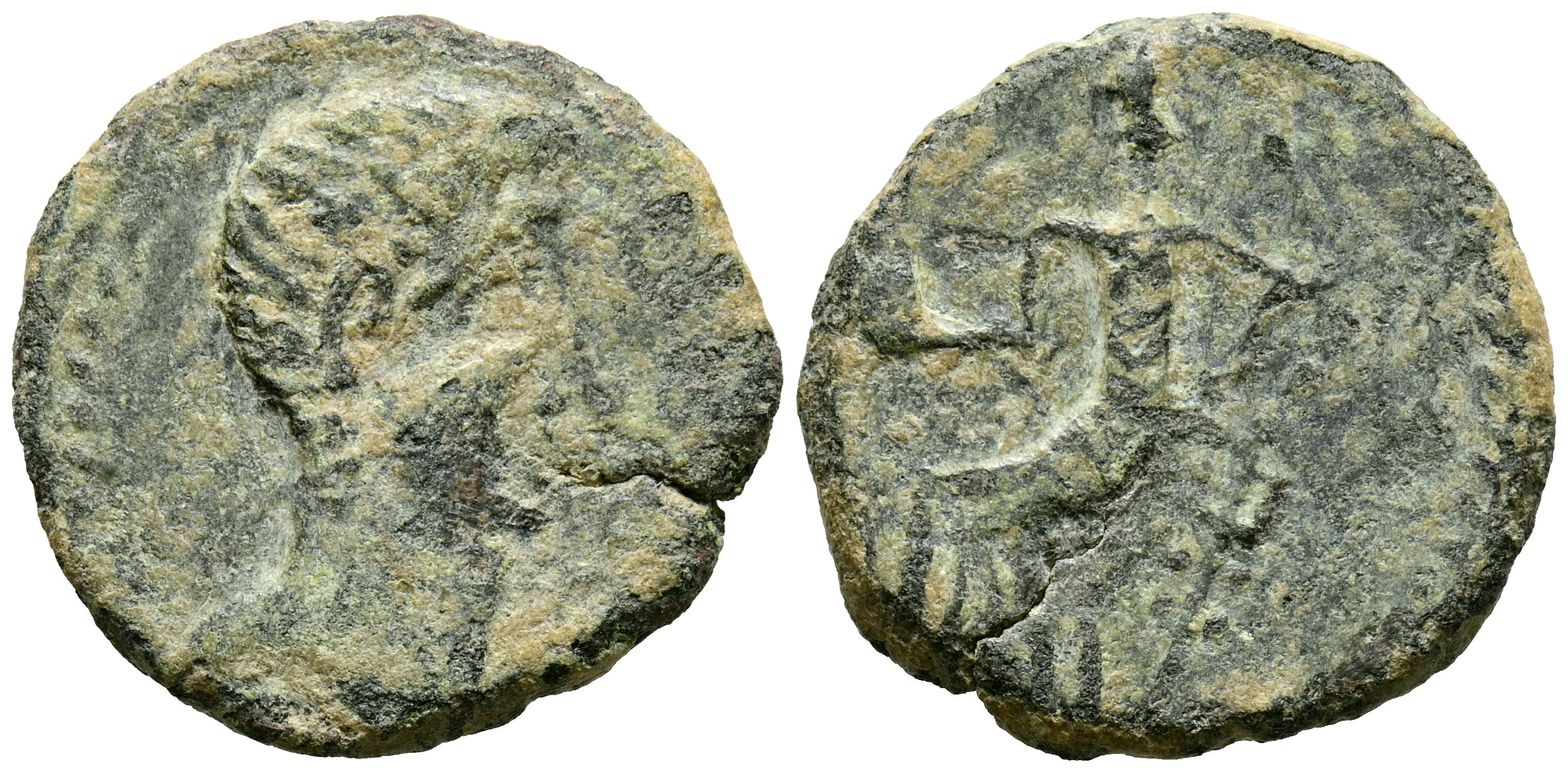 IRIPPO (Zona sur de Sevilla). Semis. (Ae. 4,78g/21mm). 30 a.C. (FAB-1581). Anv: Cabeza masculina a derecha, delante: IRIPPO. Rev: Figura femenina sentada a izquierda con piña y cornucopia. MBC.