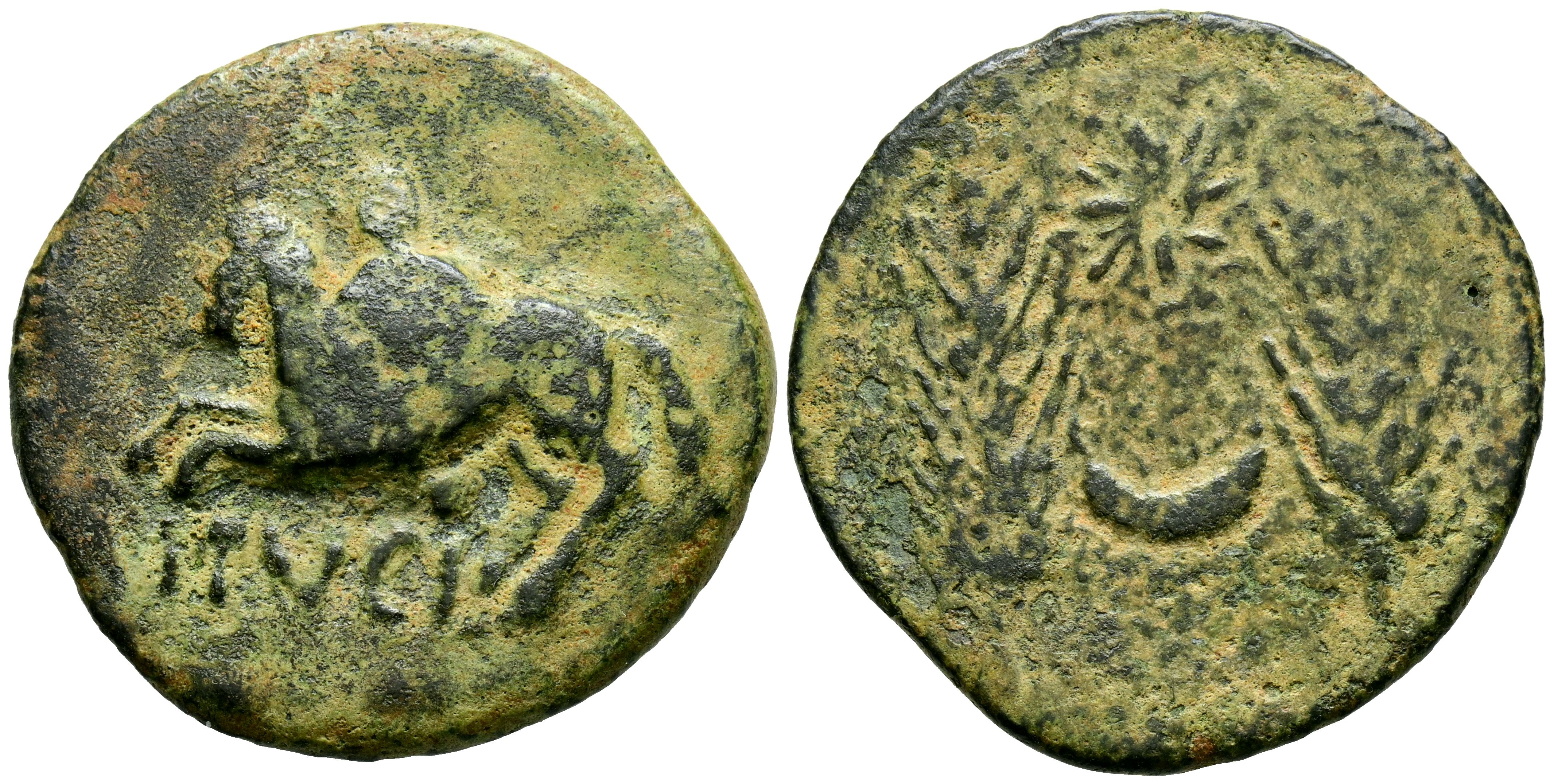 ITUCI (Tejada la Vieja, Sevilla). Dupondio. (Ae. 13,86g/30mm). 150-50 a.C. (FAB-1599). Anv: Jinete a izquierda, debajo leyenda: ITVCI. Rev: Dos espigas, entre ellas estrella y creciente. MBC-. Escaso.