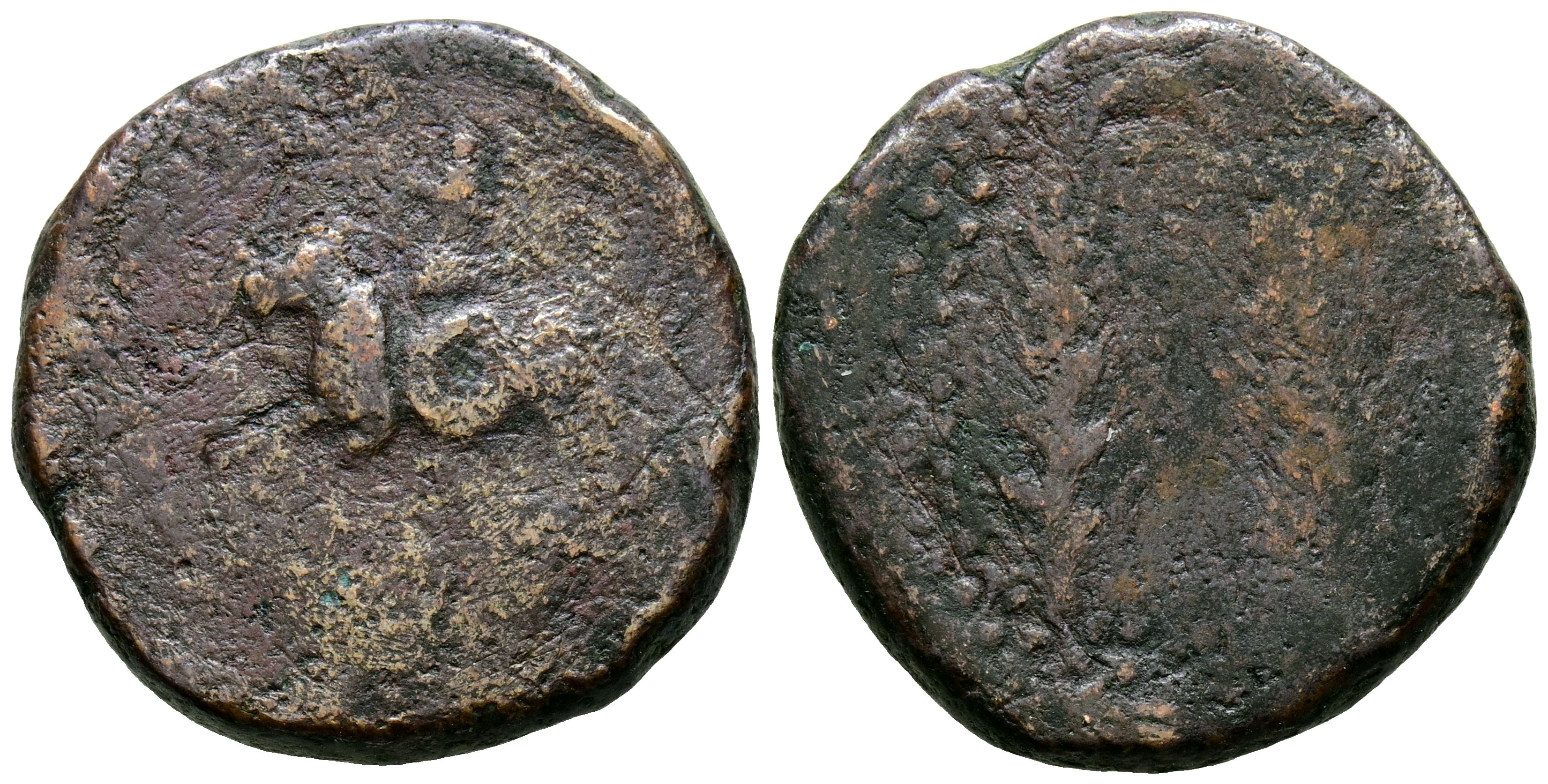 ITUCI (Tejada la Vieja, Sevilla). As. (Ae. 9,21g/23mm). 150-50 a.C. (FAB-1602). Anv: Jinete con escudo a izquierda, debajo leyenda: ITVCI. Rev: Dos espigas, entre ellas creciente y punto. BC-. Limpiada.