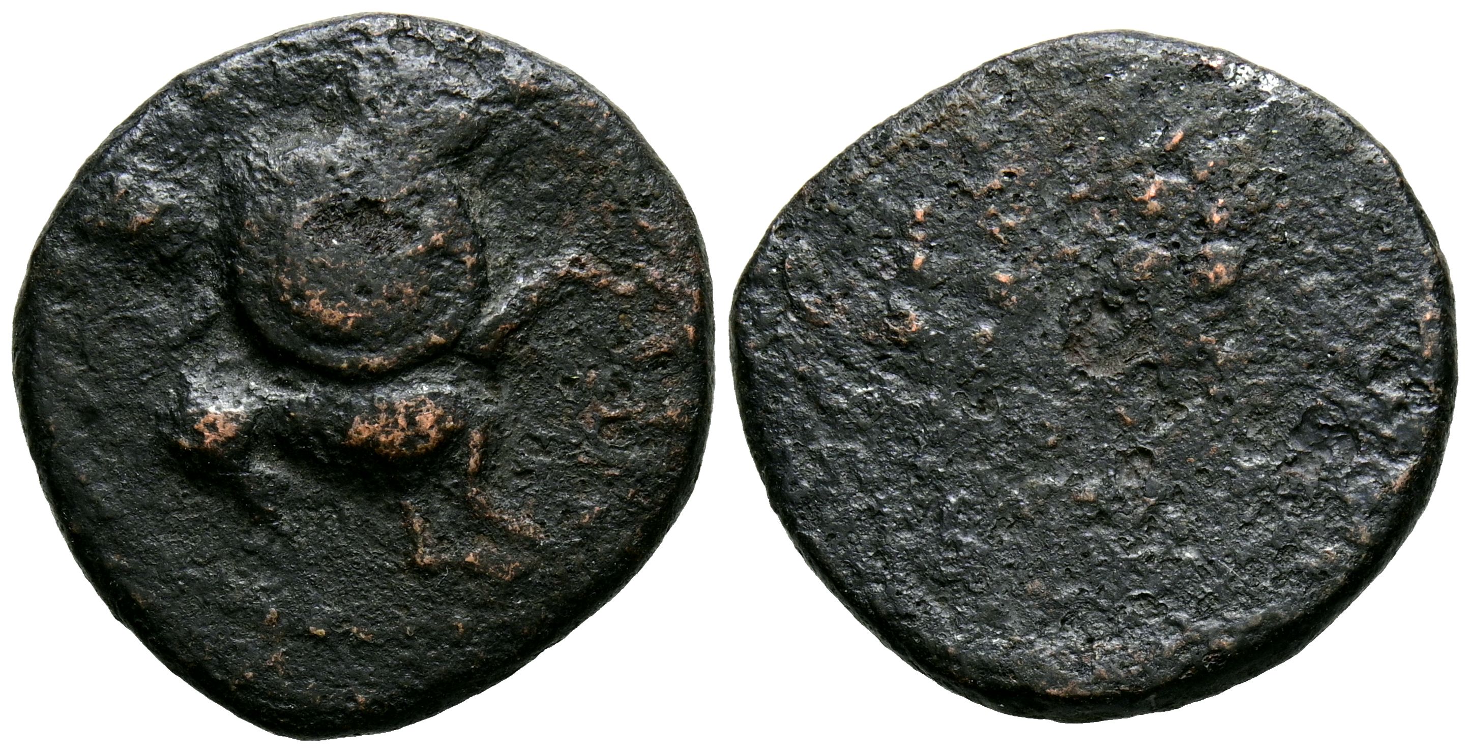 ITUCI (Tejada la Vieja, Sevilla). As. (Ae. 4,87g/20mm). 150-50 a.C. (FAB-1603). Anv: Jinete con escudo a izquierda, debajo leyenda: ITVCI. Rev: Dos espigas. BC+/BC-.