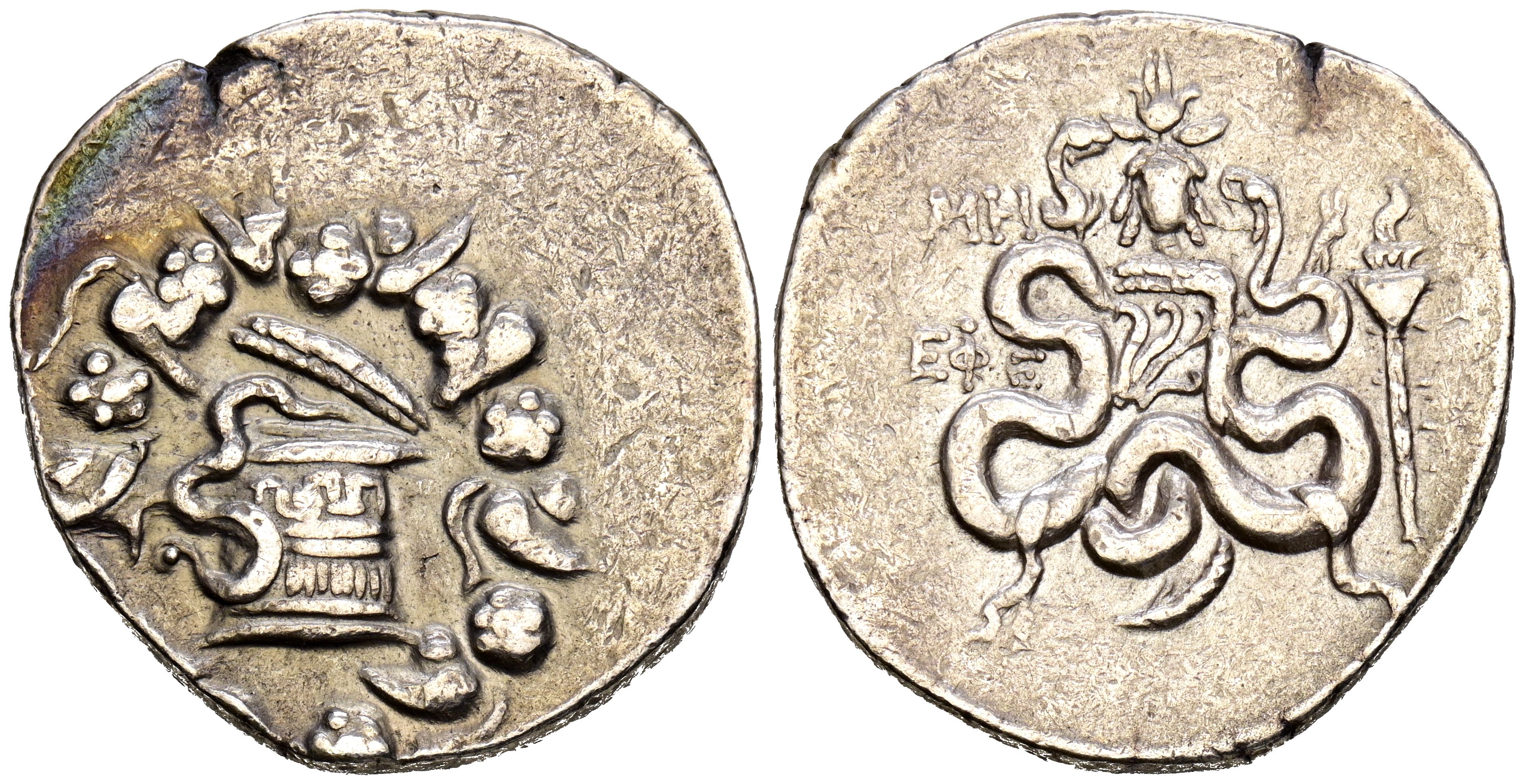 JONIA, Efesos. Cistóforo. (Ar. 12,52g/27mm). 94-93 a.C. (Año 41). Anv: Cista mística con una serpiente, rodeada de corona de yedra. Rev: Dos serpientes entrelazadas alrededor de carcaj y arco, a la izquierda EΦE, a la derecha antorcha, encima MA y abeja. MBC.