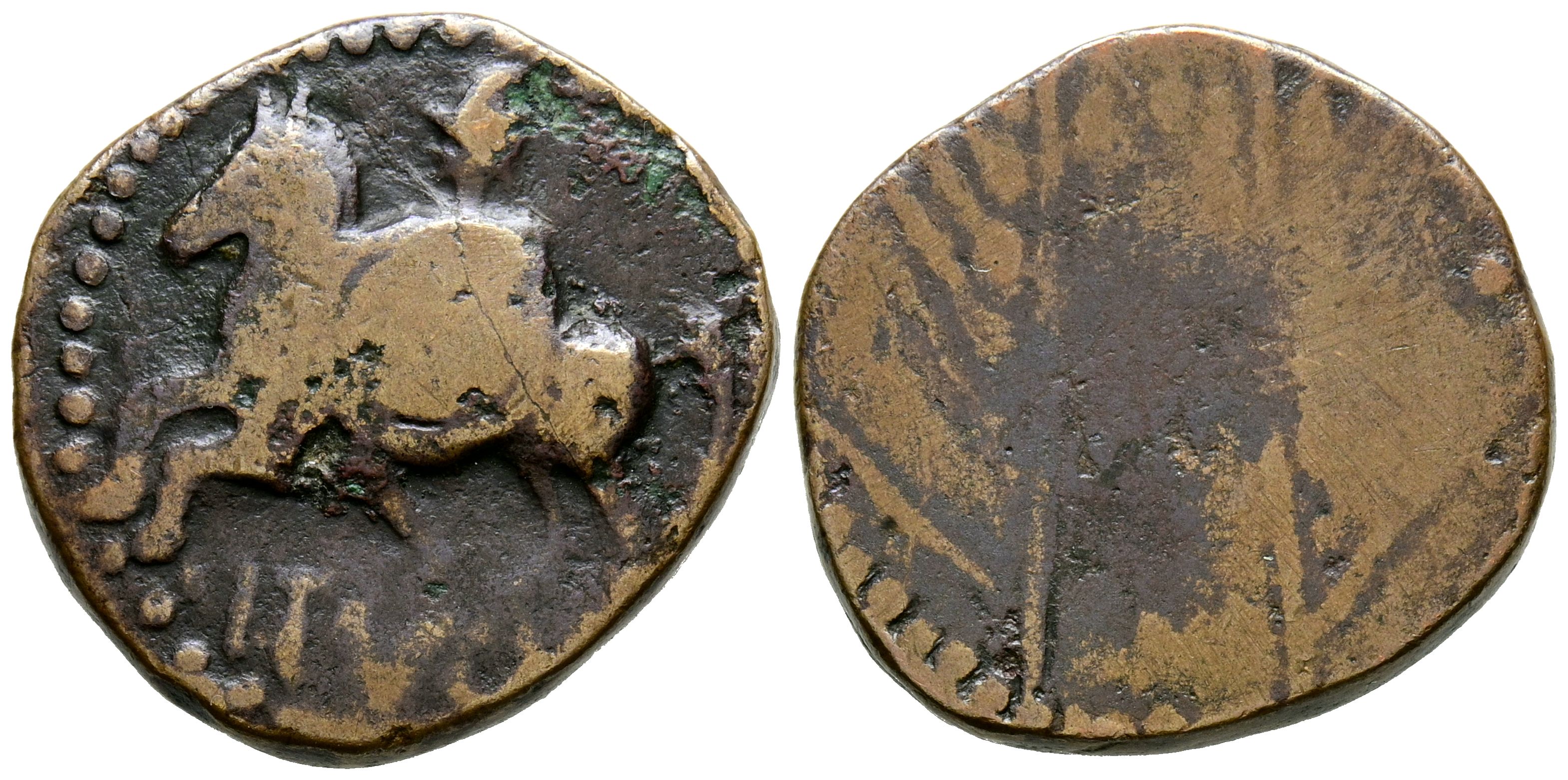 ITUCI (Tejada la Vieja, Sevilla). As. (Ae. 6,67g/22mm). 150-50 a.C. (FAB-1603). Anv: Jinete con escudo a izquierda, debajo leyenda: ITVCI. Rev: Dos espigas. BC+/BC. Limpiada.