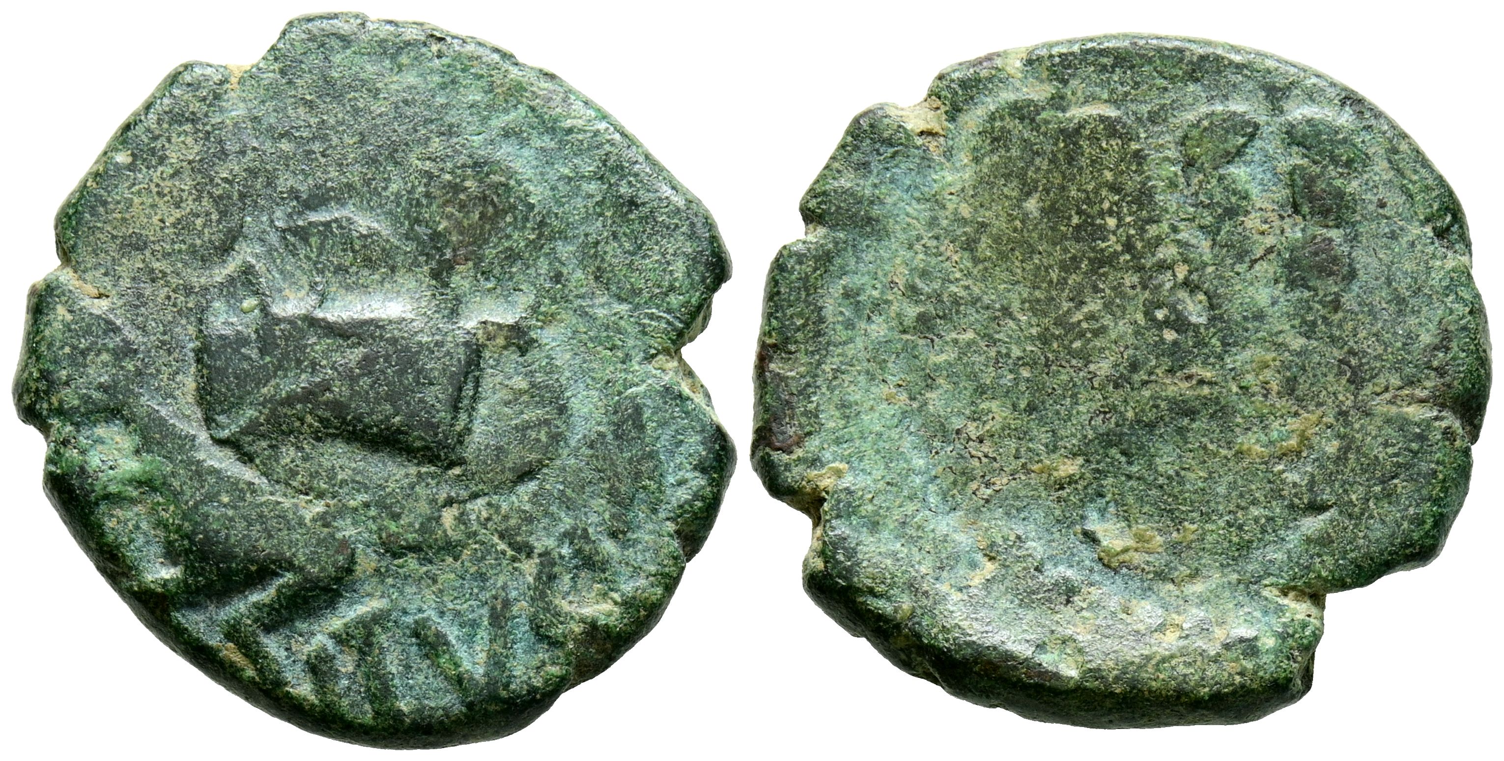 ITUCI (Tejada la Vieja, Sevilla). Semis sobre As. (Ae. 6,53g/22mm). 150-50 a.C. (FAB-1603/1607). Anv: Toro sobre jinete con escudo a izquierda, debajo leyenda: ITVCI. Rev: Dos espigas. MBC-/BC-. Rara.