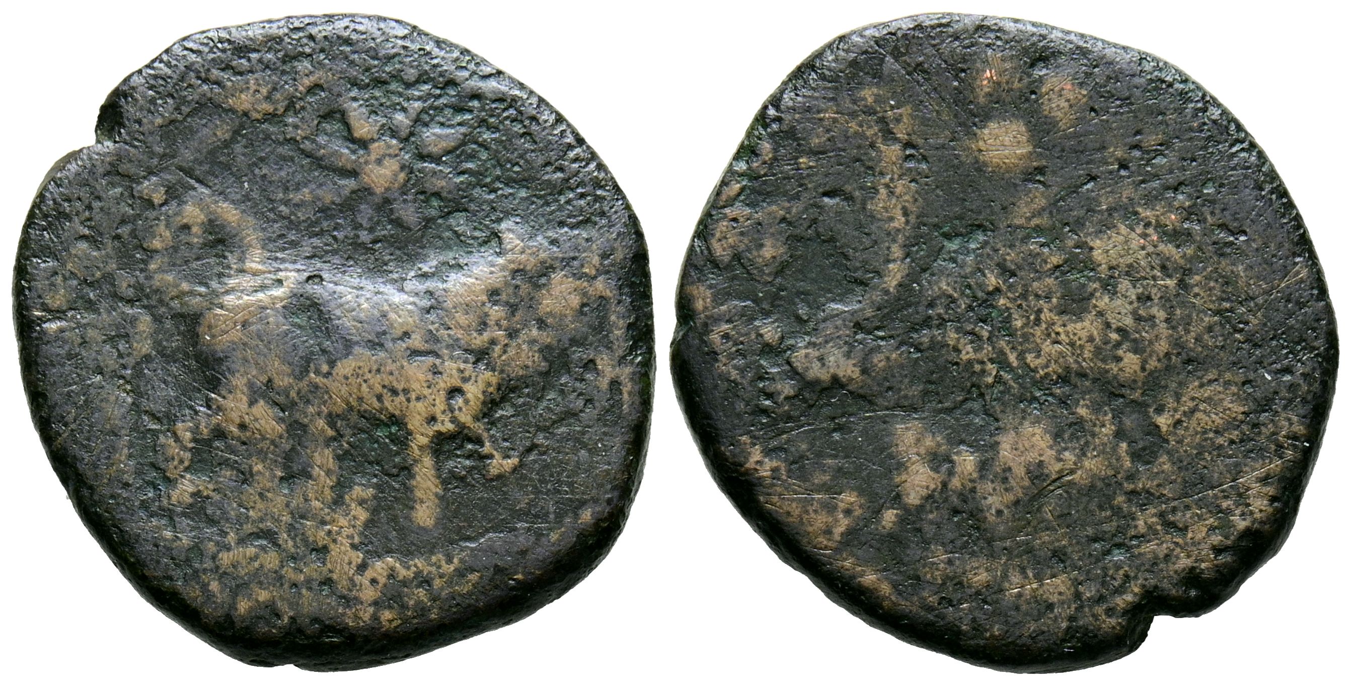 ITUCI (Tejada la Vieja, Sevilla). Semis. (Ae. 3,77g/19mm). 150-50 a.C. (FAB-1606). Anv: Toro a derecha, encima estrella. Rev: Espiga a derecha, encima tres puntos, debajo leyenda púnica. BC-/RC. Escasa.