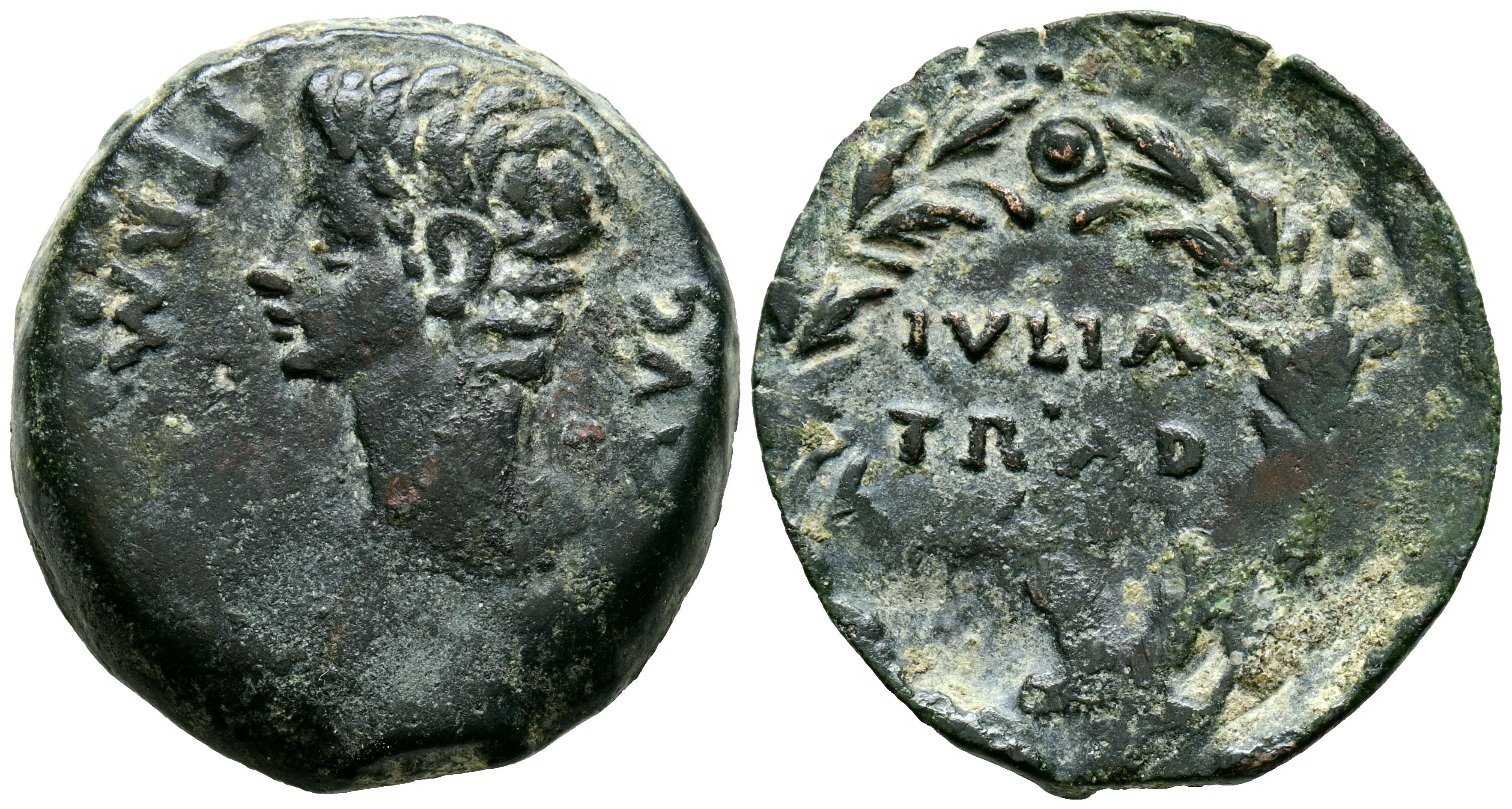 IULIA TRADUCTA (Algeciras, Cádiz). As. (Ae. 9,79g/26mm). 27 a.C.-14 d.C. (FAB-1614). Anv: Cabeza de Augusto a izquierda, alrededor leyenda: PERM CAES AVG. Rev: Leyenda: IVLIA/TRAD, dentro de corona de laurel. MBC.