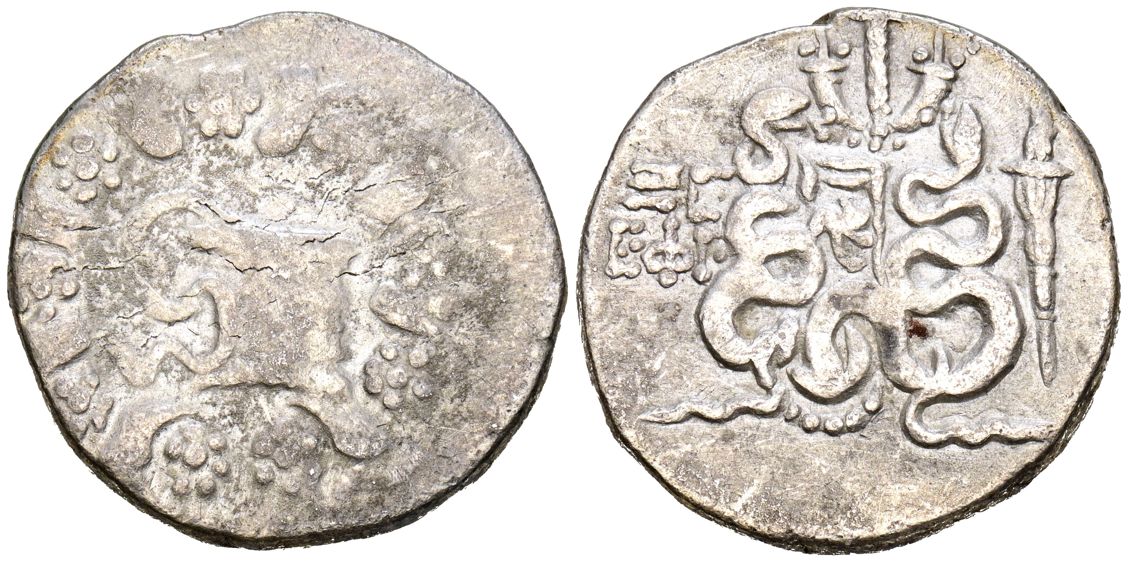 JONIA, Efesos. Cistóforo. (Ar. 11,72g/26mm). 70-69 a.C. (Año 65). (BMC 168). Anv: Cista mística con una serpiente, rodeada de corona de yedra. Rev: Dos serpientes entrelazadas alrededor de carcaj y arco, a la izquierda ΞE/EΦΕ, a la derecha antorcha, encima dos cornucopias. MBC-/MBC.