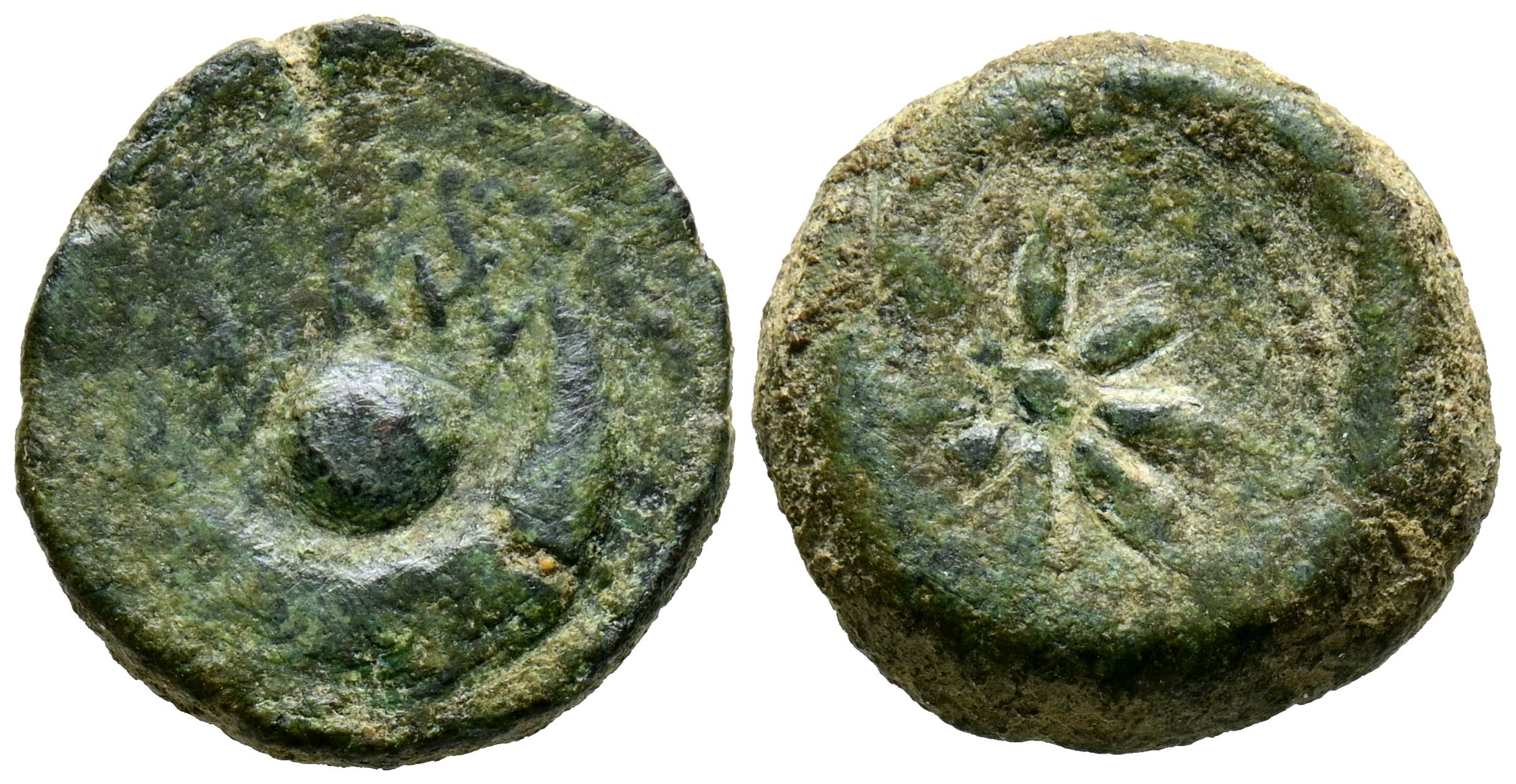 MALACA (Málaga). Cuadrante. (Ae. 4,74g/17mm). 200-20 a.C. (FAB-1743). Anv: Creciente y punto, debajo leyenda púnica. Rev: Estrella de ocho rayos. MBC-.