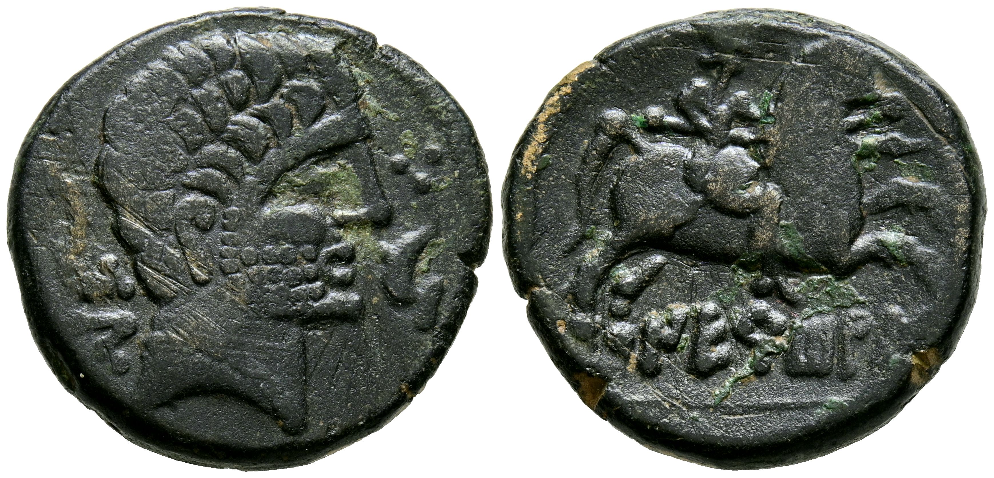 NERTOBIS (Calatorao, Zaragoza). As. (Ae. 9,79g/24mm). 120-20 a.C. (FAB-1771). Anv: Cabeza masculina a derecha entre dos delfines, detrás letra ibérica N. Rev: Jinete con lanza a derecha, debajo leyenda ibérica: NERToBiS. MBC-.