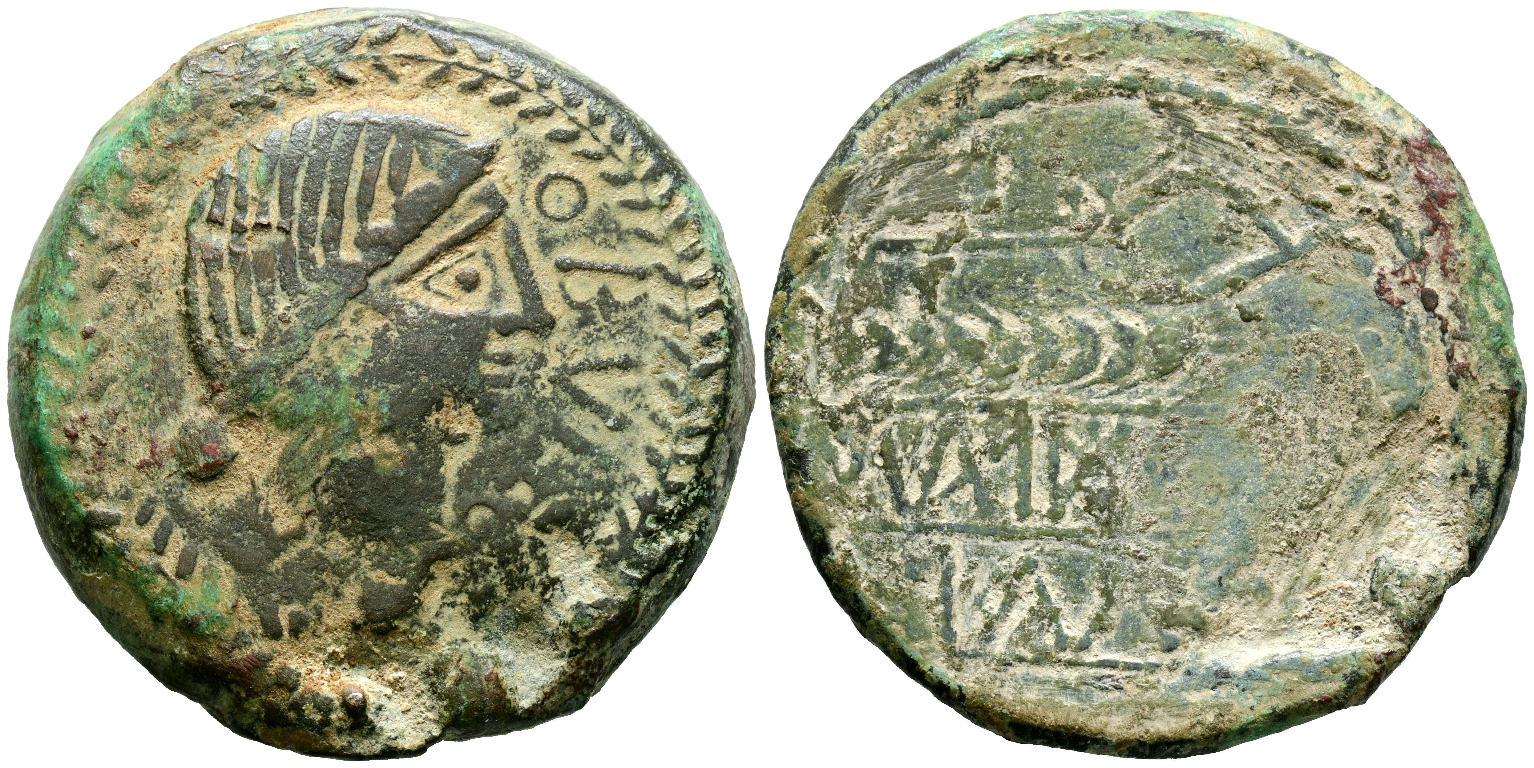 OBULCO (Porcuna, Jaén). Dupondio. (Ae. 27,81g/35 mm). 220-20 a.C. (FAB-1779). Anv: Cabeza femenina diademada a la derecha, delante: OBVLCO. Rev: Arado a la derecha y espiga a la izquierda, debajo leyenda ibérica: SIUBoLAI/ORCaIL. MBC/MBC-. Escasa.