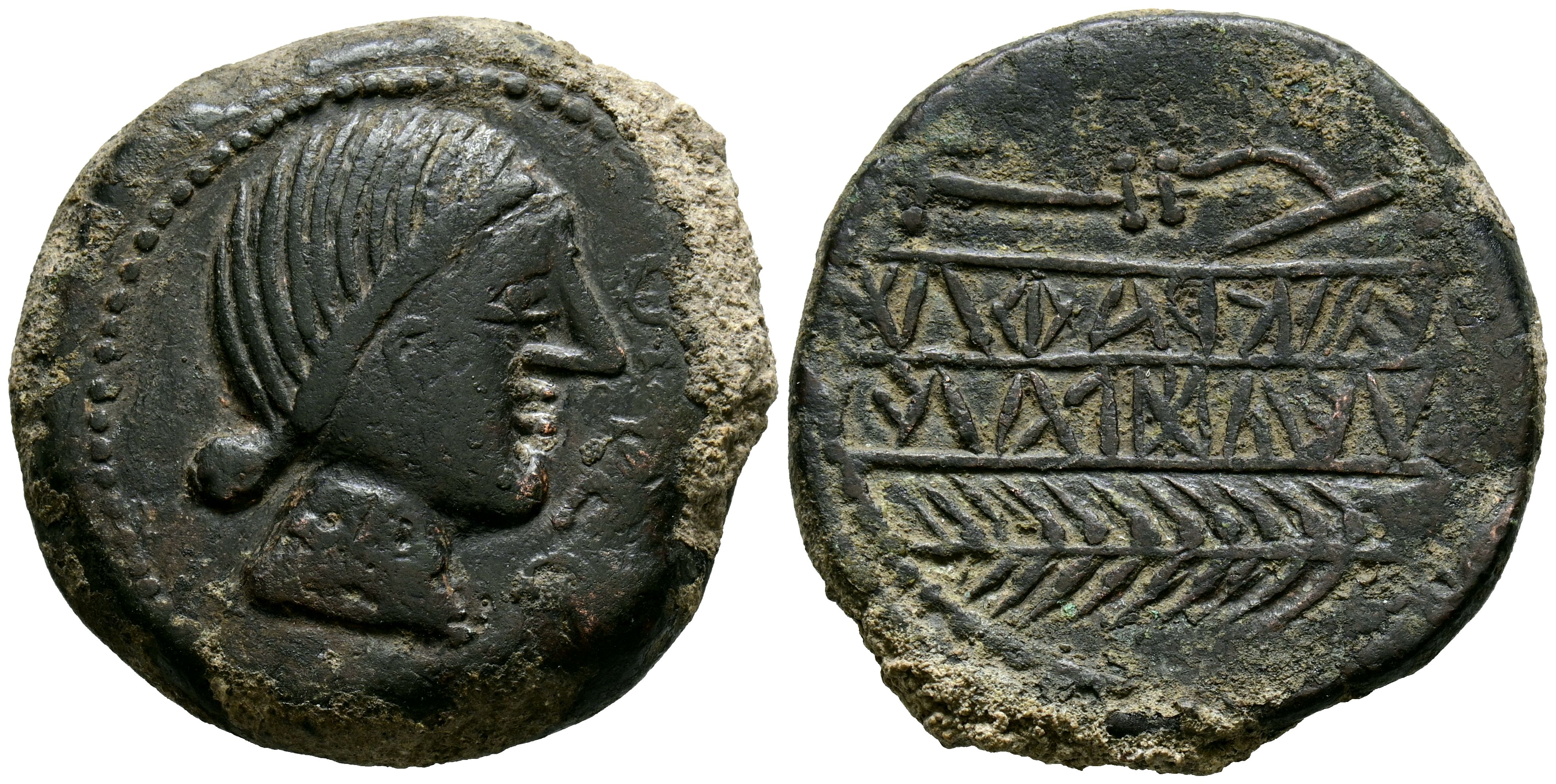 OBULCO (Porcuna, Jaén). As. (Ae. 21,88g/31mm). 220-20 a.C. (FAB-1786). Anv: Cabeza femenina a derecha, delante leyenda: OBVLCO. Rev: Arado a derecha, debajo espiga a izquierda, entre ellos leyenda: ISCeRATeN/UIUBoLAI. MBC.