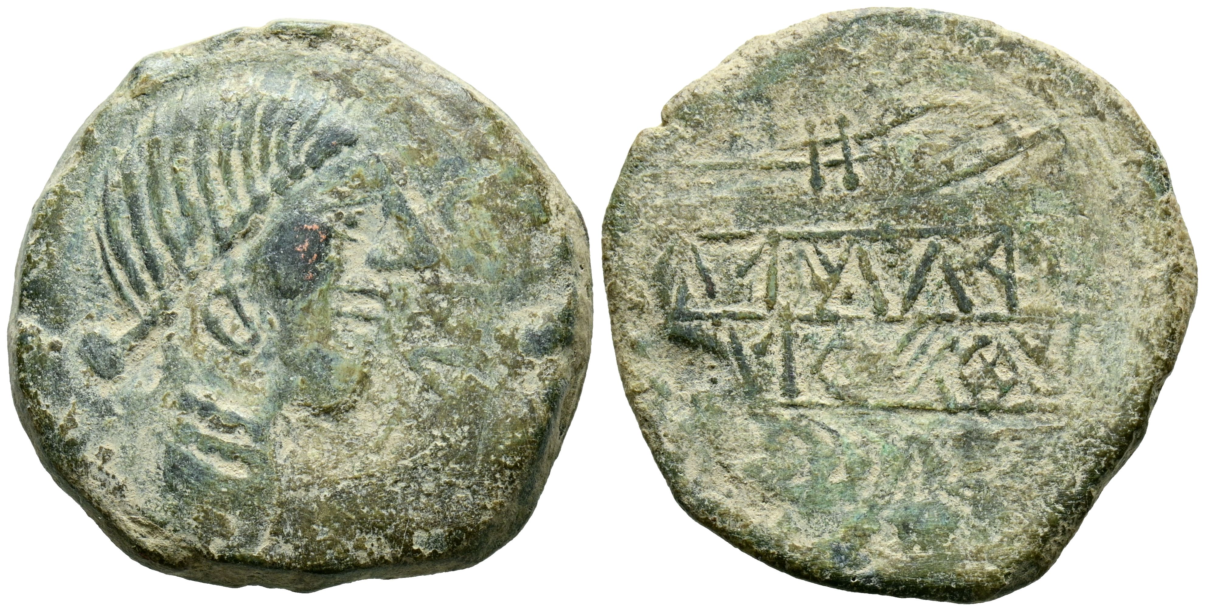 OBULCO (Porcuna, Jaén). As. (Ae. 15,81g/28mm). 220-20 a.C. (FAB-1791). Anv: Cabeza femenina a derecha, delante leyenda: OBVLCO. Rev: Espiga a derecha, debajo espiga a izquierda, entre ellos leyenda: ORCaILV/NTuSTuLDuCo, letra: Ta encima de espiga. MBC-.