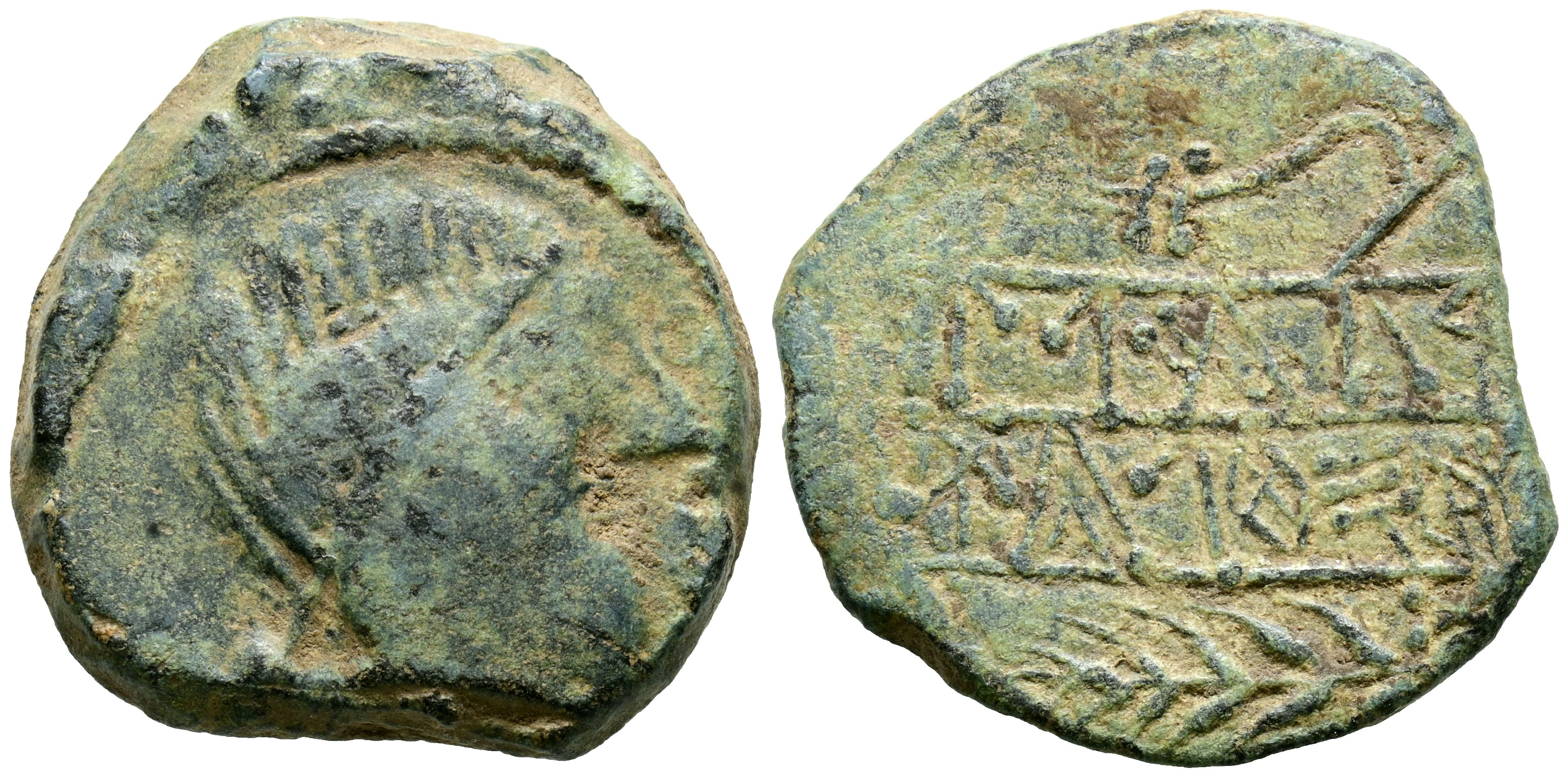 OBULCO (Porcuna, Jaén). As. (Ae. 14,42g/28mm). 220-20 a.C. (FAB-1791). Anv: Cabeza femenina a derecha, delante leyenda: OBVLCO. Rev: Espiga a derecha, debajo espiga a izquierda, entre ellos leyenda: ISCeRATeN/UIUBoLAI, sobre la espiga, letra ibera: Ta. MBC-.