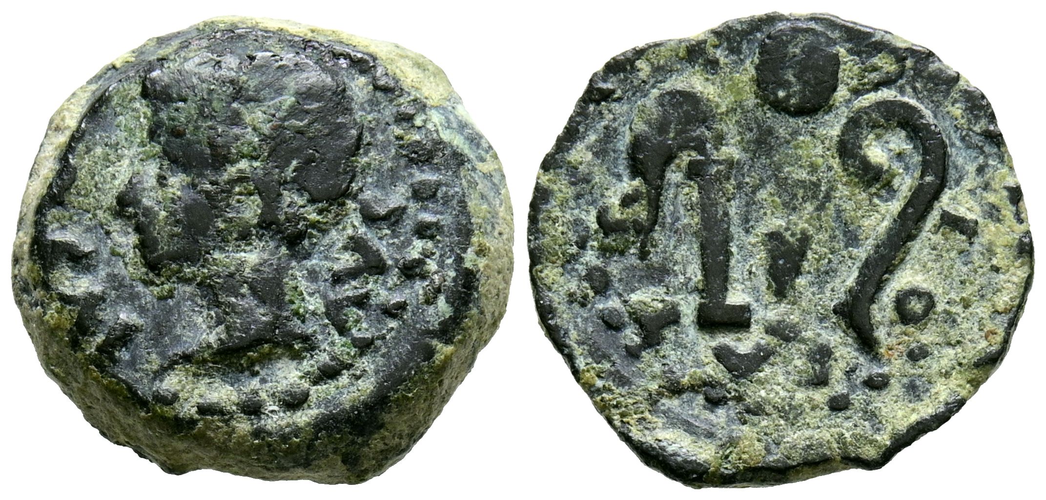COLONIA PATRICIA (Córdoba). Cuadrante. (Ae. 2,45g/15mm). 27 a.C.-14 d.C. (FAB-1993). Anv: Cabeza de Augusto a izquierda, alrededor leyenda: PER CAE AVG. Rev: Aspérgilo, preferículo, lítuo y patera, alrededor leyenda: COLO PATR. MBC.