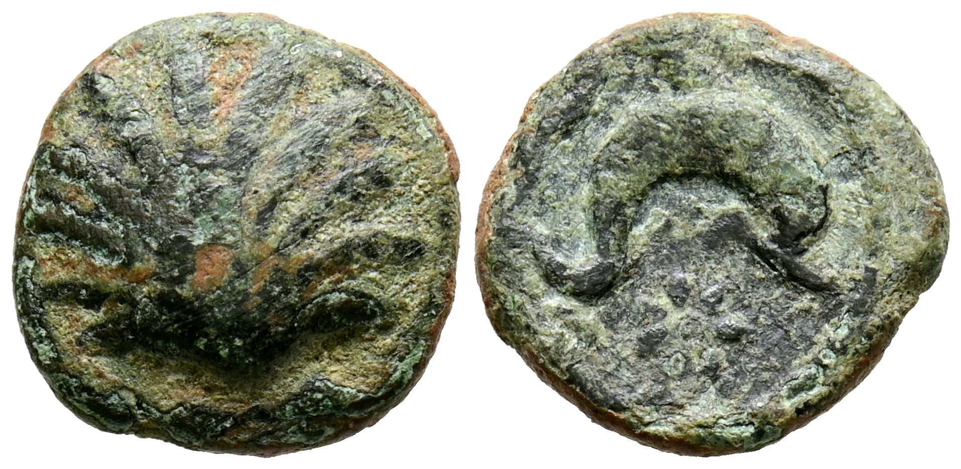 ARSE-SAGUNTO (Sagunto, Valencia). Sextante. (Ae. 2,26g/13mm). 170-20 a.C. (FAB-2064). Anv: Concha. Rev: Delfín a derecha, encima creciente, debajo letra ibérica A y estrella. MBC-.