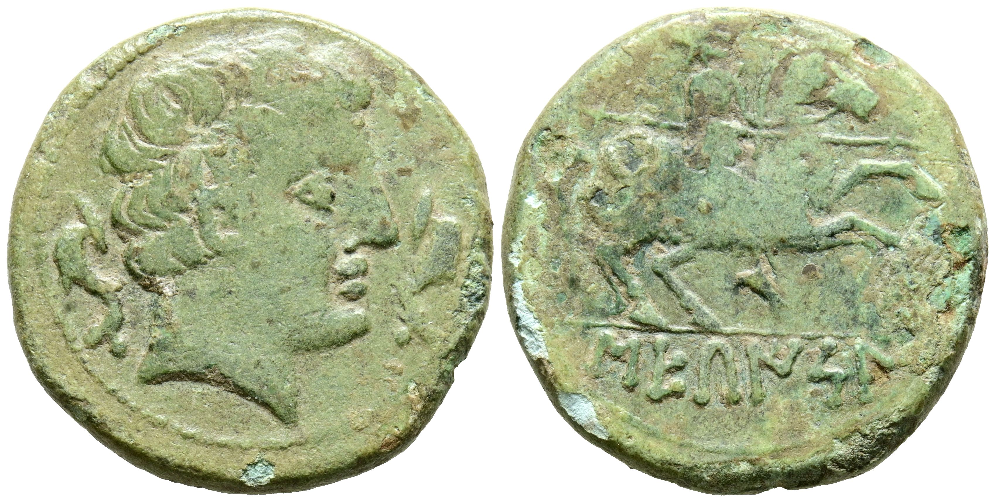 SECAISA (Segeda, Zaragoza). As. (Ae. 6,61g/22mm). 120-20 a.C. (FAB-2131). Anv: Cabeza masculina a derecha entre delfines. Rev: Jinete con lanza a derecha, debajo leyenda bajo línea: SECaISA. MBC.