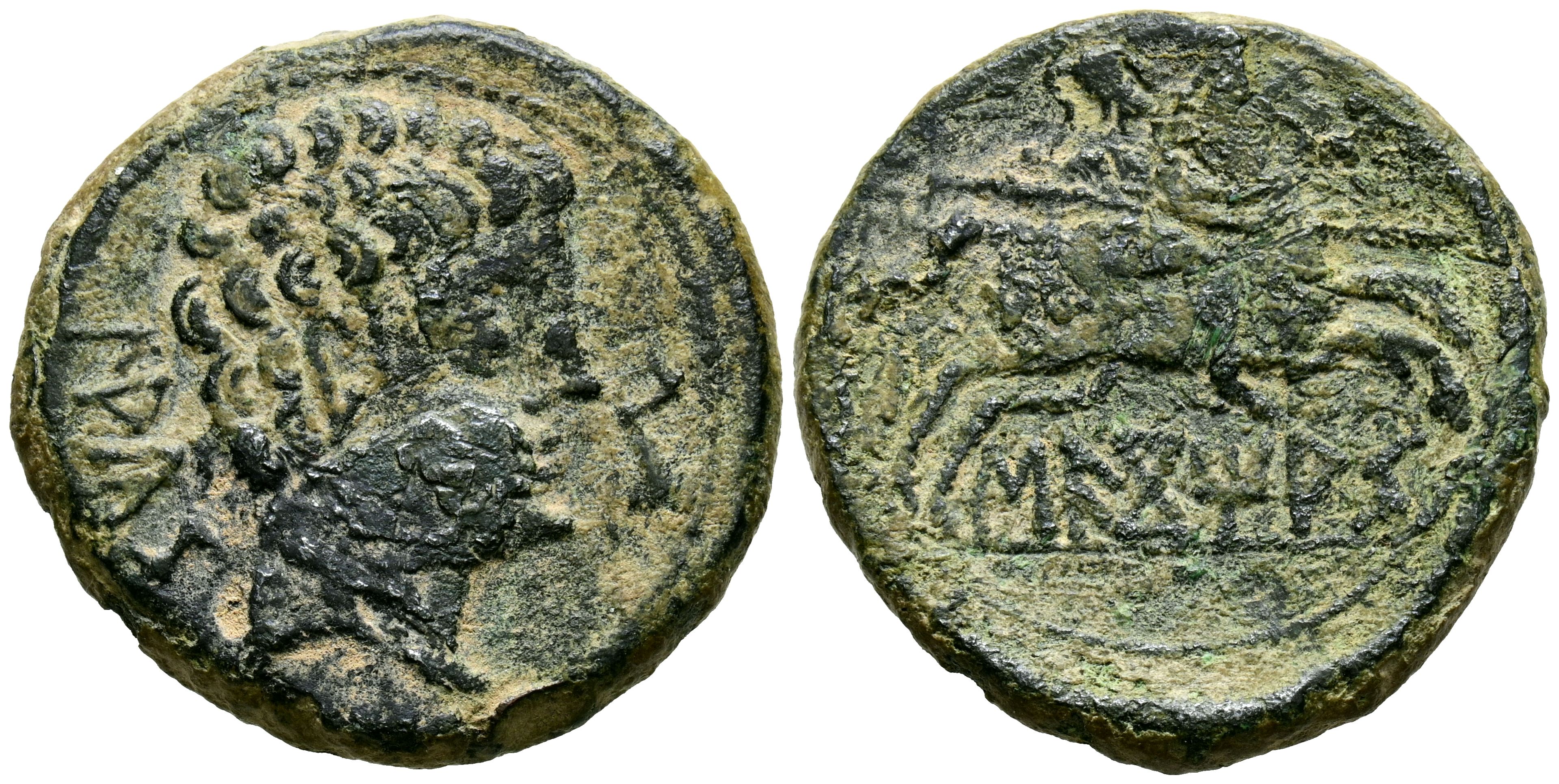 SECOTIAS (Sigüenza, Guadalajara). As. (Ae. 11,07g/26mm). 120-20 a.C. (FAB-2153). Anv: Cabeza masculina a derecha, delante delfín, detrás leyenda ibérica: LACaS. Rev: Jinete con lanza a derecha, debajo leyenda ibérica: SECoTiAS. MBC. Escaso ejemplar.