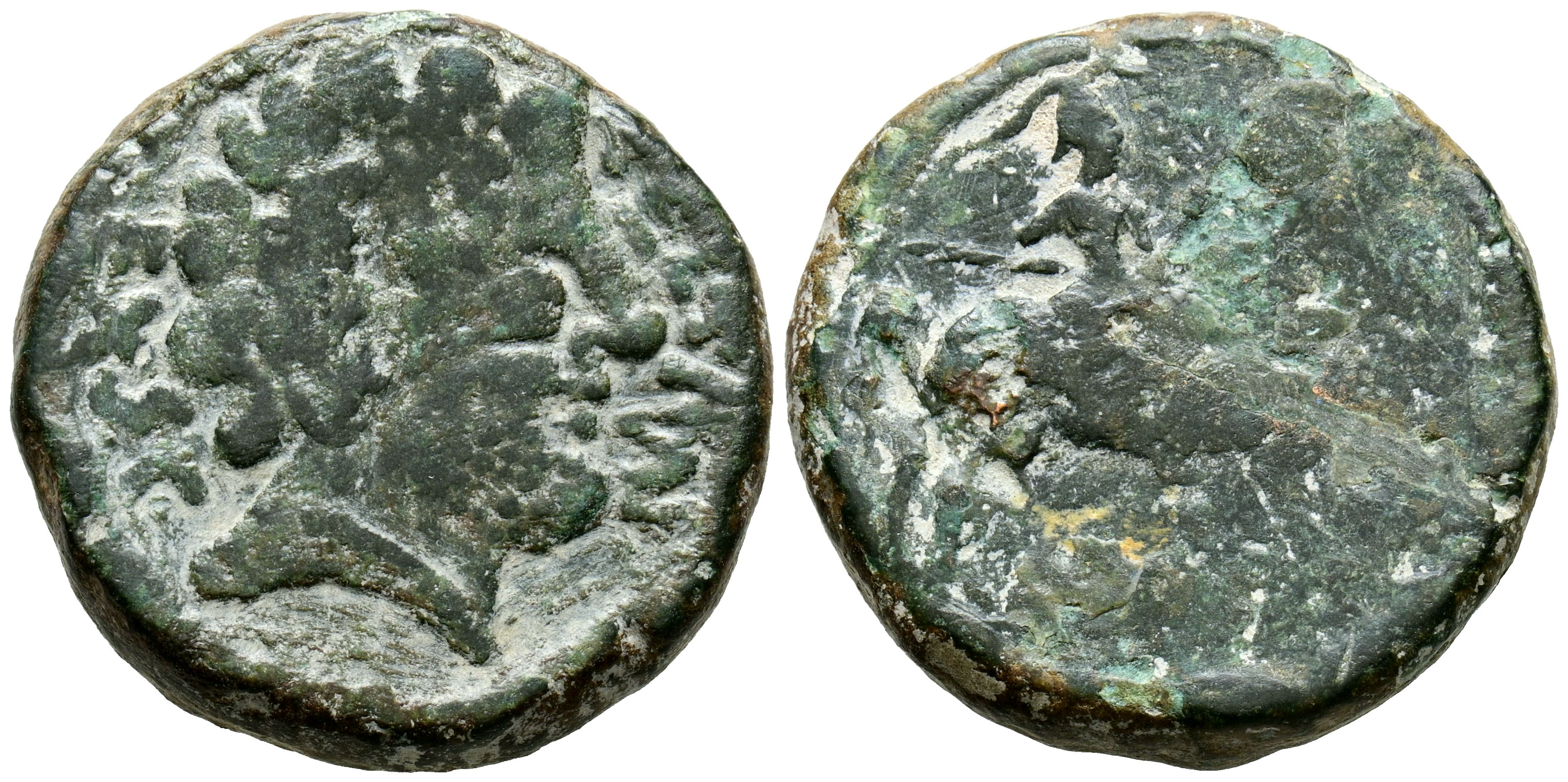 TOLE (Toledo). As. (Ae. 15,11g/26mm). 50-20 a.C. (FAB-2402). 120-20 a.C. (FAB-2401). Anv: Cabeza masculina a derecha, alrededor leyenda: EX SC CELTAMB. Rev: Jinete con lanza a derecha, debajo leyenda: TOLE. MBC-/BC-. Limpiado.