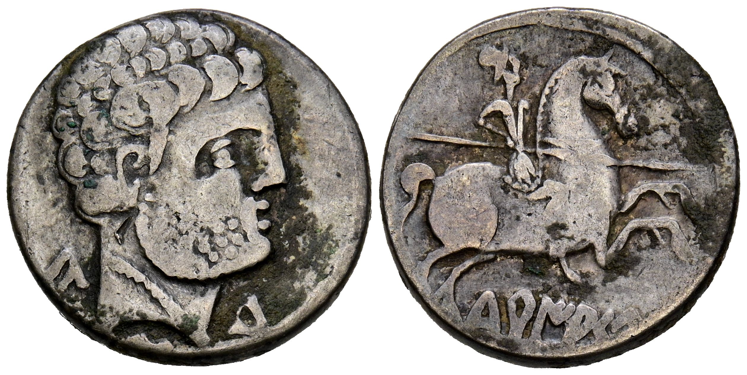 TURIASO (Tarazona, Zaragoza). Denario. (Ar. 3,58g/18mm). 120-20 a.C. (FAB-2412). Anv: Cabeza masculina barbada a derecha, detrás letra: CA, debajo: S y delante: Du. Rev: Jinete con lanza a derecha, debajo leyenda ibérica sobre línea: TuRIASU. MBC-.