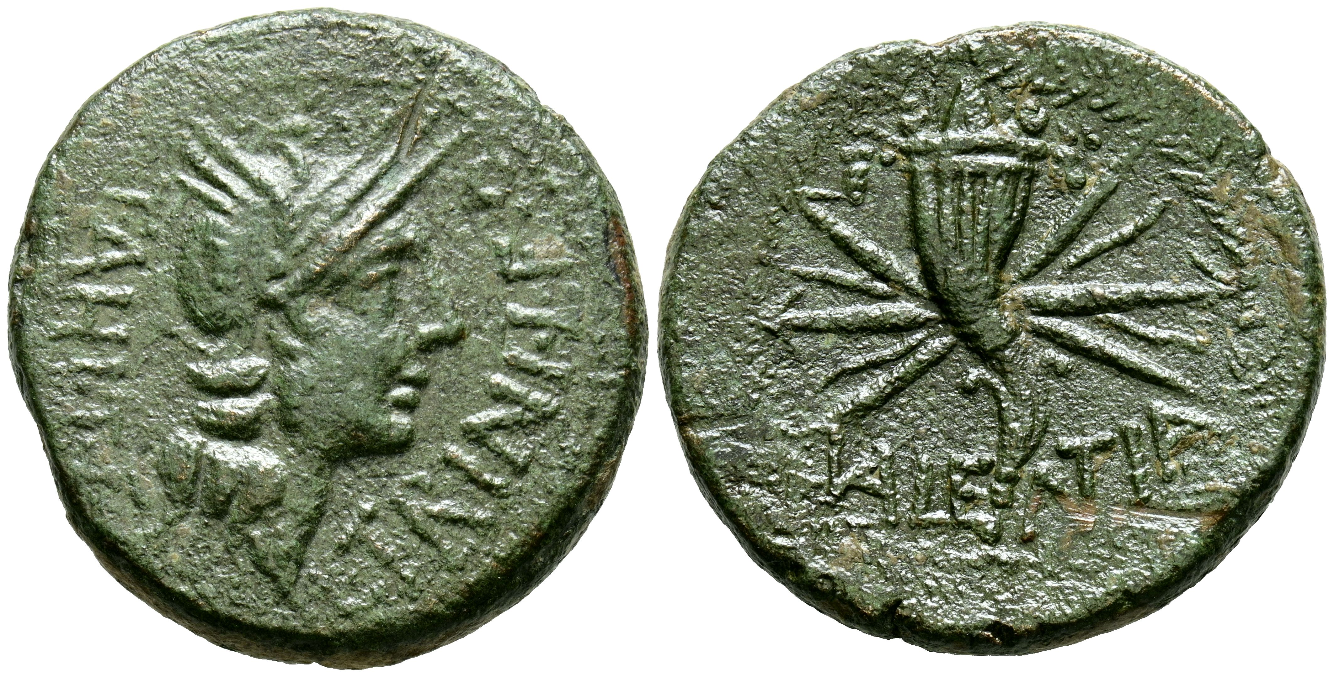 VALENTIA (Valencia). As. (Ae. 16,85g/30mm). 150-50 a.C. (FAB-2512). Anv: Cabeza galeada de Roma a derecha, alrededor leyenda: TAHI T F Y L TRINI L F Q. Rev: Cornucopia sobre haz de rayos, debajo leyenda: VALENTIA, todo dentro de láurea. MBC. Pátina verde.