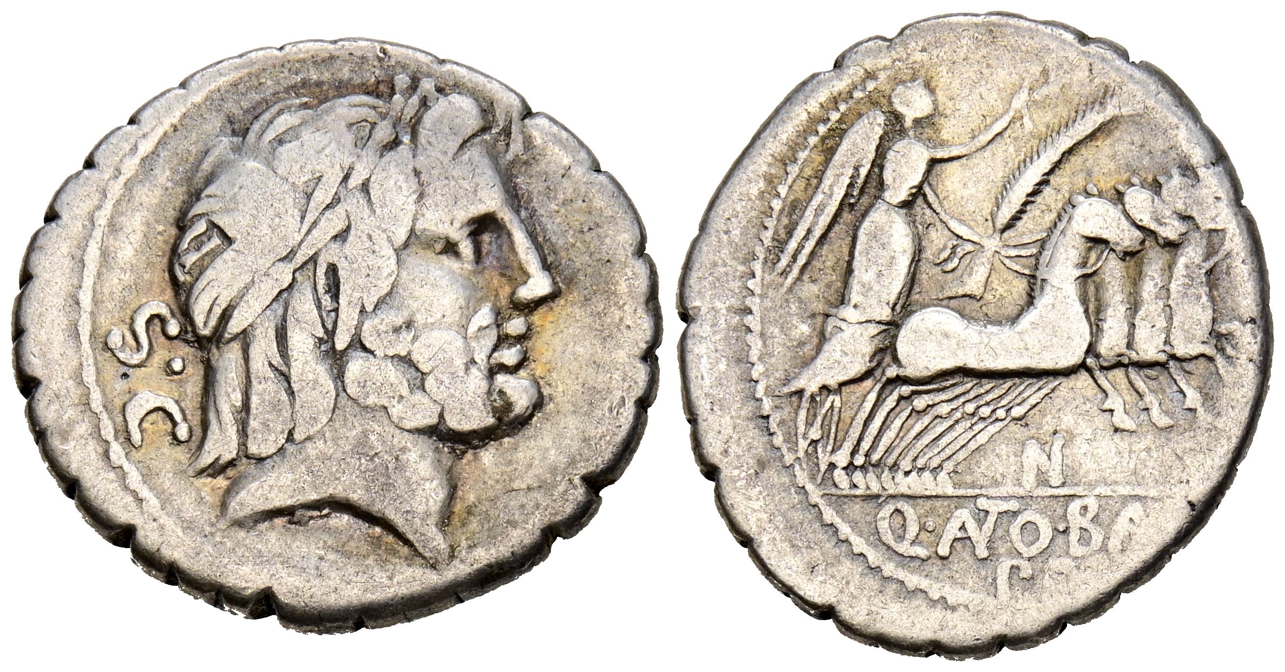 GENS ANTONIA. Denario. (Ar. 3,83g/19mm). 83-82 a.C. Taller auxiliar de Roma. (FFC 156; Crawford 364/1d). Anv: Cabeza laureada de Júpiter a derecha, detras SC. Rev: Victoria en cuádriga a derecha con palma y corona de laurel, debajo letra N, en exergo: Q ANTO BALB PR. MBC-.