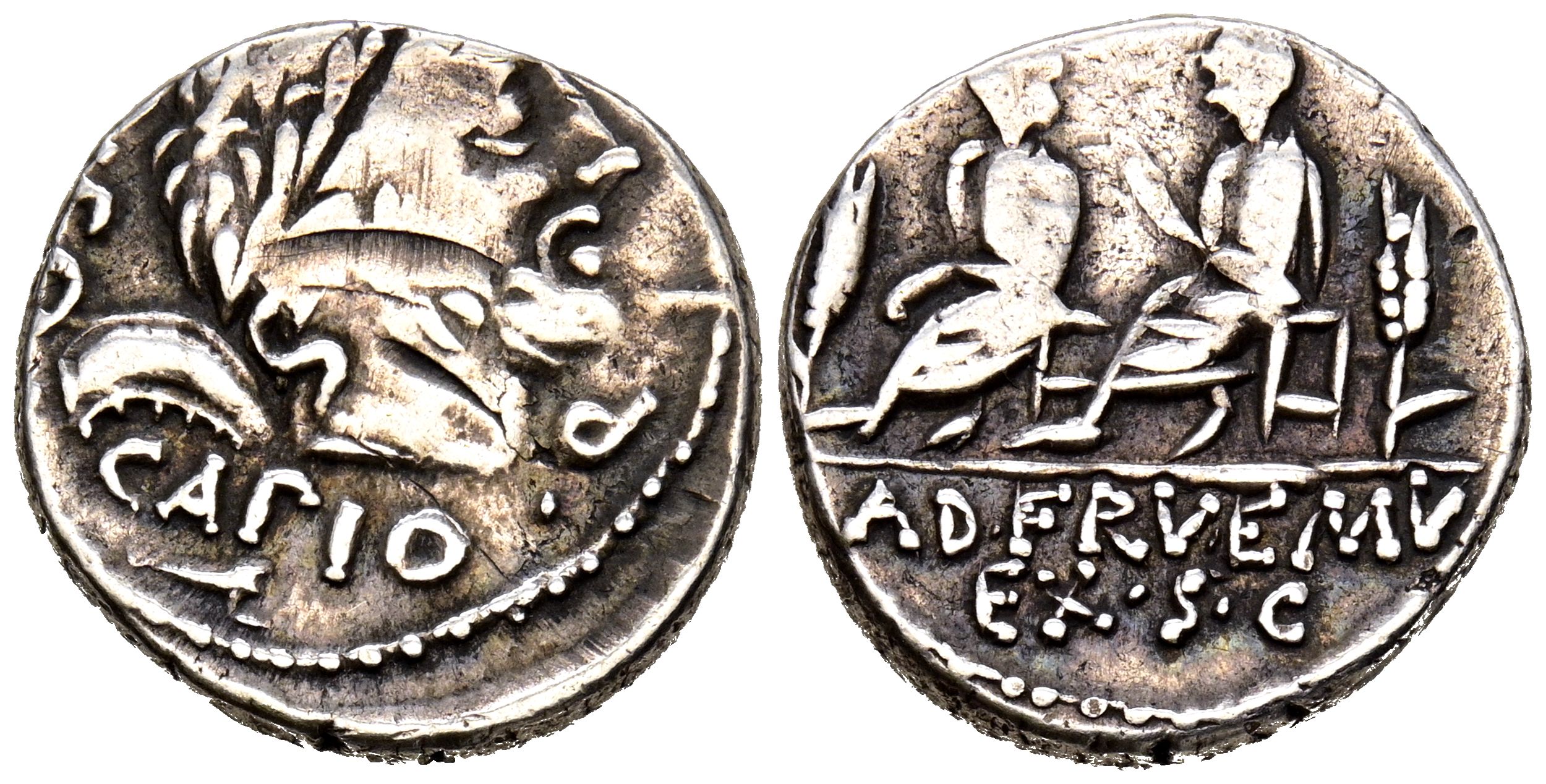 GENS CALPURNIA. Denario. (Ar. 3,93g/17mm). 100 a.C. Taller auxiliar de Roma. (FFC 226; Crawford 330/1a). Anv: Cabeza laureada de Saturno a derecha, detrás arpa, alrededor leyenda: PISO CAEPIO Q. Rev: Los questores Piso y Caepio sentados a izquierda entre dos espigas, en exergo: AD FRV EMV/EX SC. MBC-. Golpe en anverso.