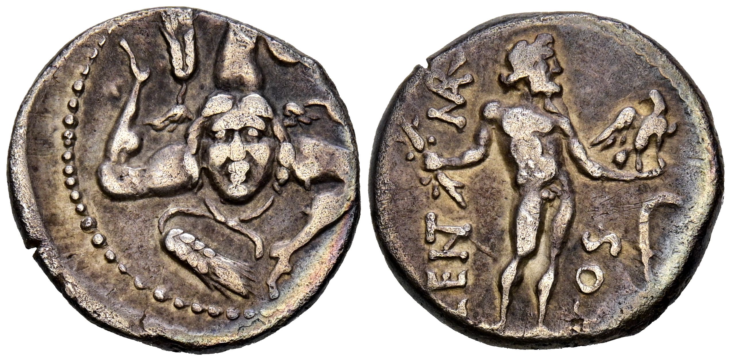 GENS CORNELIA. Denario. (Ar. 3,76g/18mm). 56 a.C. Sicilia. (FFC 644; Crawford 445/1a). Anv: Triquetra con espigas separando las tres piernas, en el centro la cabeza de Medusa. Rev: Júpiter estante a derecha portando águila y haz de rayos, delante guadaña, alrededor leyenda: LENT MAR COS. MBC+.
