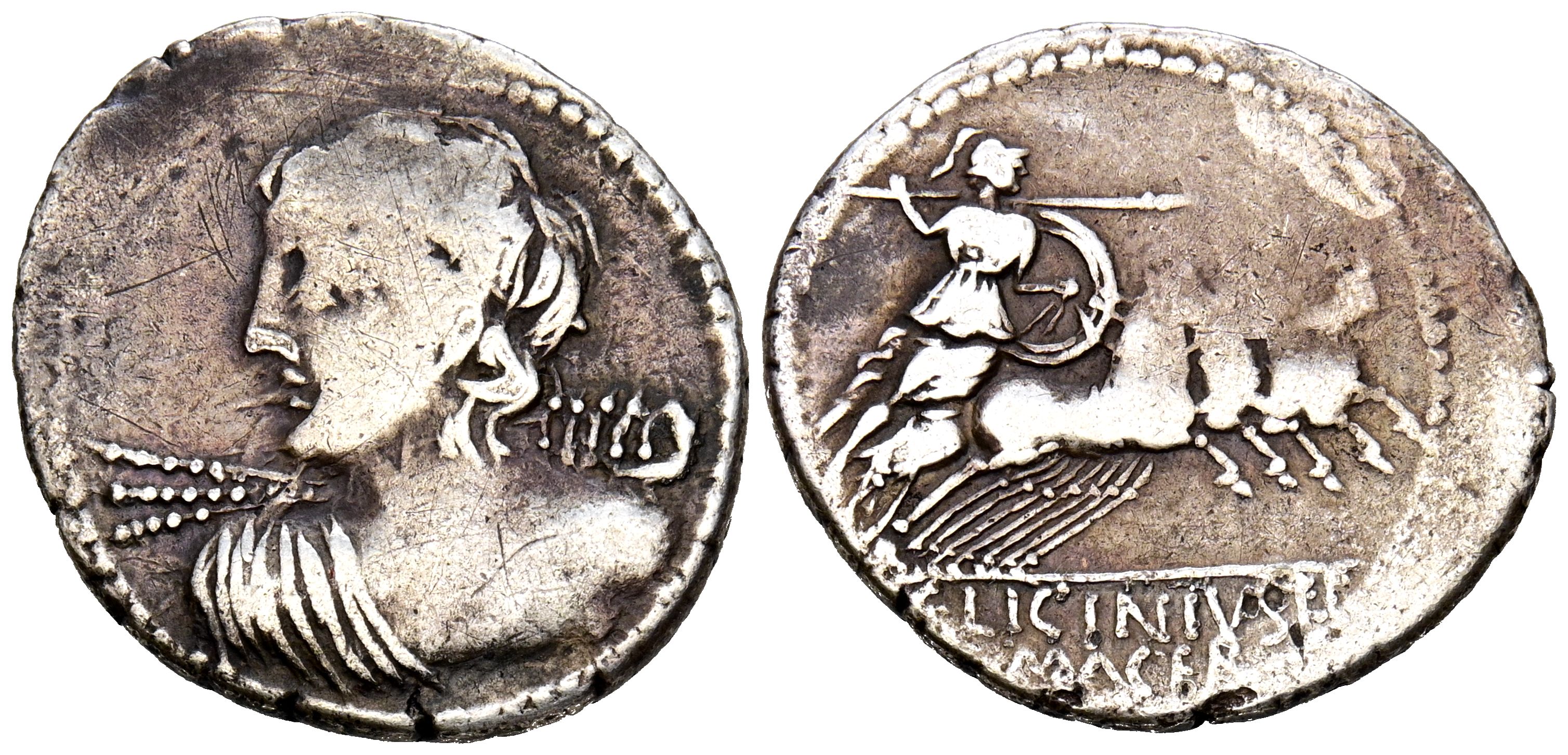 GENS LICINIA. Denario. (Ar. 3,65g/22mm). 84 a.C. Taller auxiliar de Roma. (FFC 803; Crawford 354/1). Anv: Busto diademado de Apolo a izquierda con haz de rayos en la mano. Rev: Minerva en cuádriga con lanza y escudo a derecha, en exergo: C LICINIVS LF/MACER. MBC.