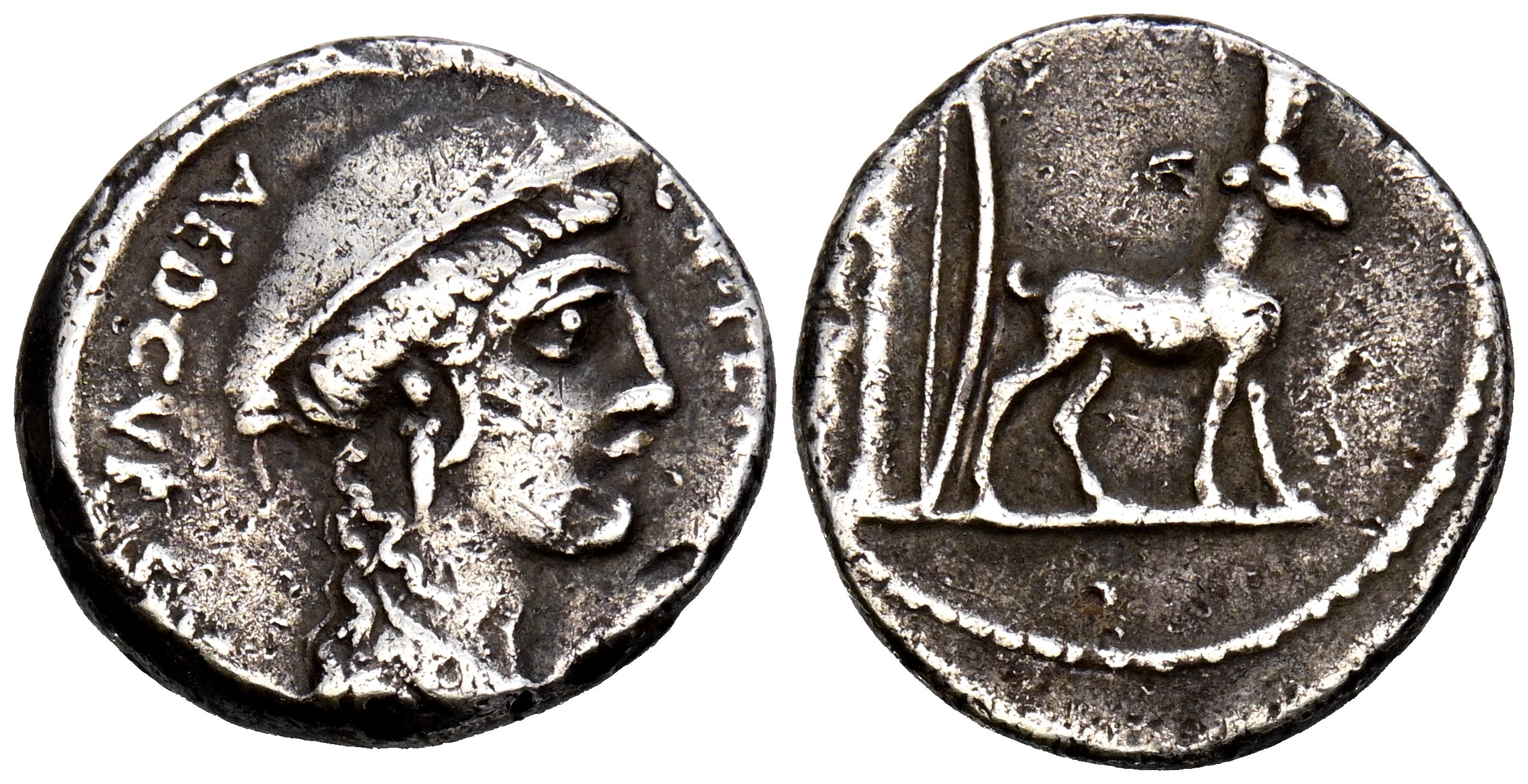 GENS PLANCIA. Denario. (Ar. 4,06g/19mm). 55 a.C. Roma. (FFC 991; Crawford 432/1). Anv: Cabeza de Diana Planciana a derecha, alrededor leyenda: CN PLANCIVS AED CVR SC. Rev: Cabra a derecha, detrás carcaj y arco. MBC.