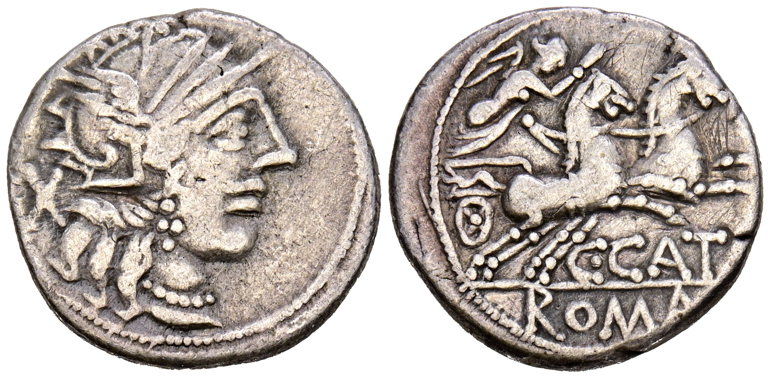 GENS PORCIA. Denario. (Ar. 3,84g/18mm). 123 a.C. Taller auxiliar de Roma. (FFC 1050; Crawford 274/1). Anv: Cabeza de Roma a derecha, detrás X. Rev: Victoria con látigo en biga a derecha, denajo leyenda: C CATO, en exergo: ROMA. MBC-.