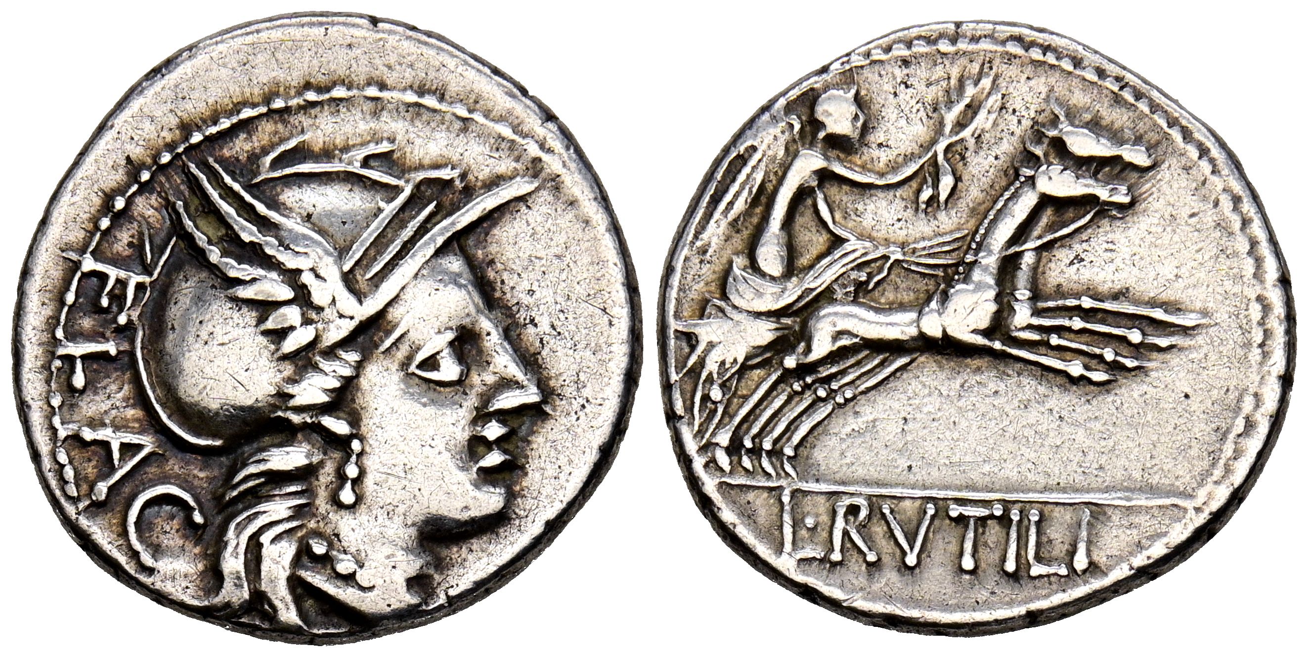 GENS RUTILIA. Denario. (Ar. 3,79g/19mm). 77 a.C. Roma. (FFC 1095; Crawford 387/1). Anv: Cabeza de Roma a derecha, detrás leyenda: FLAC. Rev: Victoria con corona en biga a derecha, en exergo: L RVTILI. MBC.