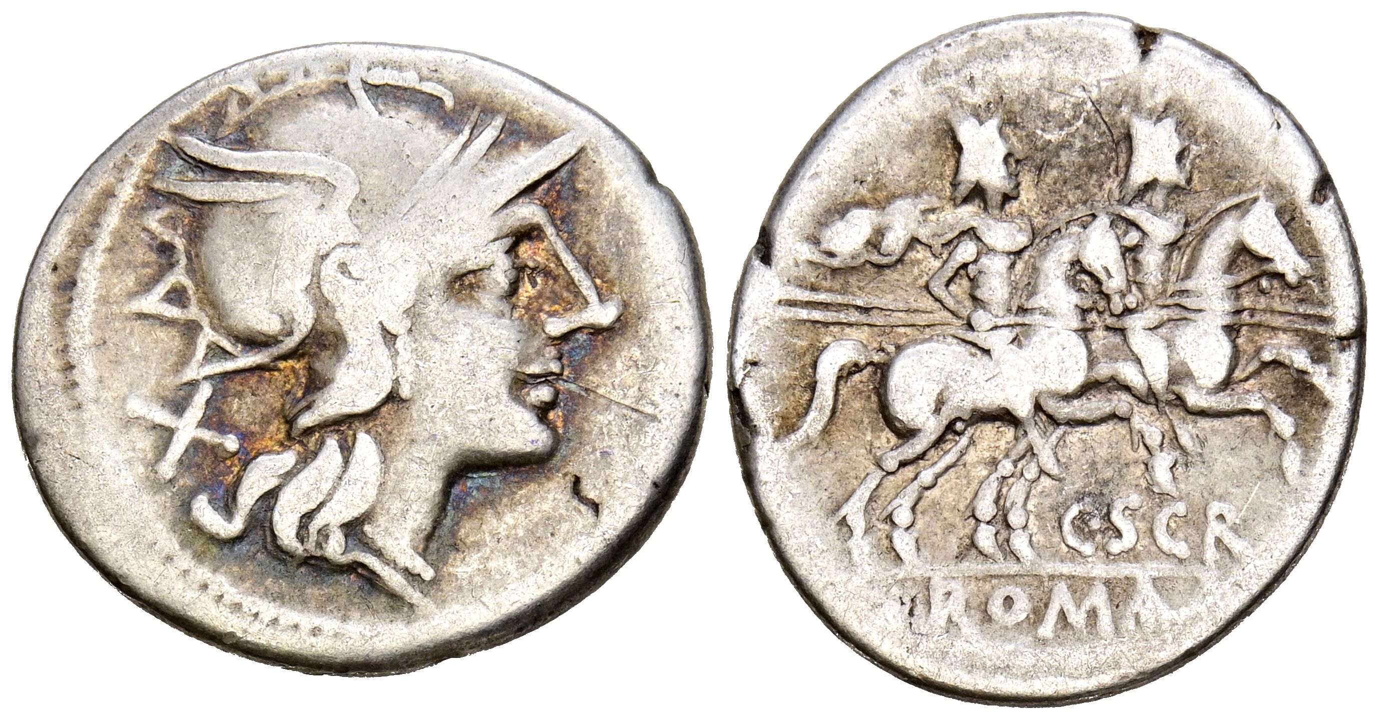 GENS SCRIBONIA. Denario. (Ar. 3,62g/20mm). 154 a.C. Roma. (FFC 1100; Crawford 201/1). Anv: Cabeza de Roma a derecha, detrás X. Rev: Los Dioscuros a caballos a derecha, encima estrellas, debajo leyenda: C SCR, en exergo: ROMA. MBC.