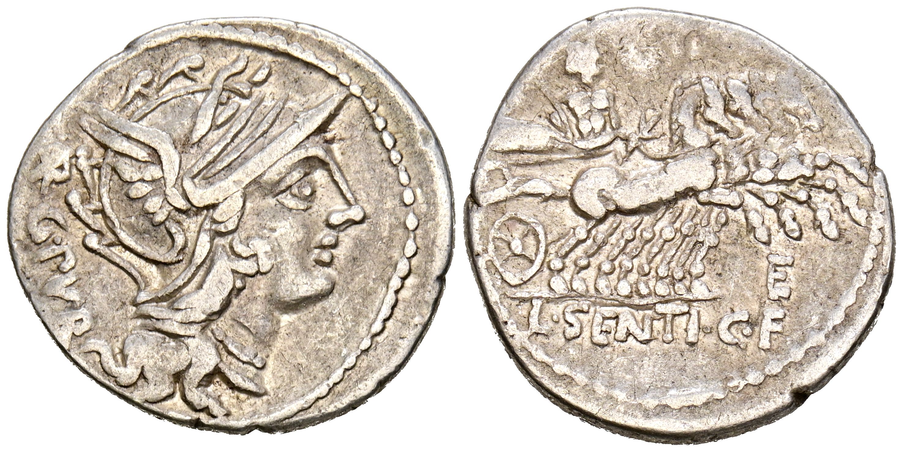 GENS SENTIA. Denario forrado. (Ar. 3,98g/21mm). 101 a.C. Norte de Italia. (FFC 1109; Crawford 325/1b). Anv: Cabeza de Roma galeada, detrás leyenda: ARG PVB. Rev: Júpiter con cetro y haz de rallos en cuádriga a derecha, S encima de los caballos, en exergo: L SENTI CF. MBC.