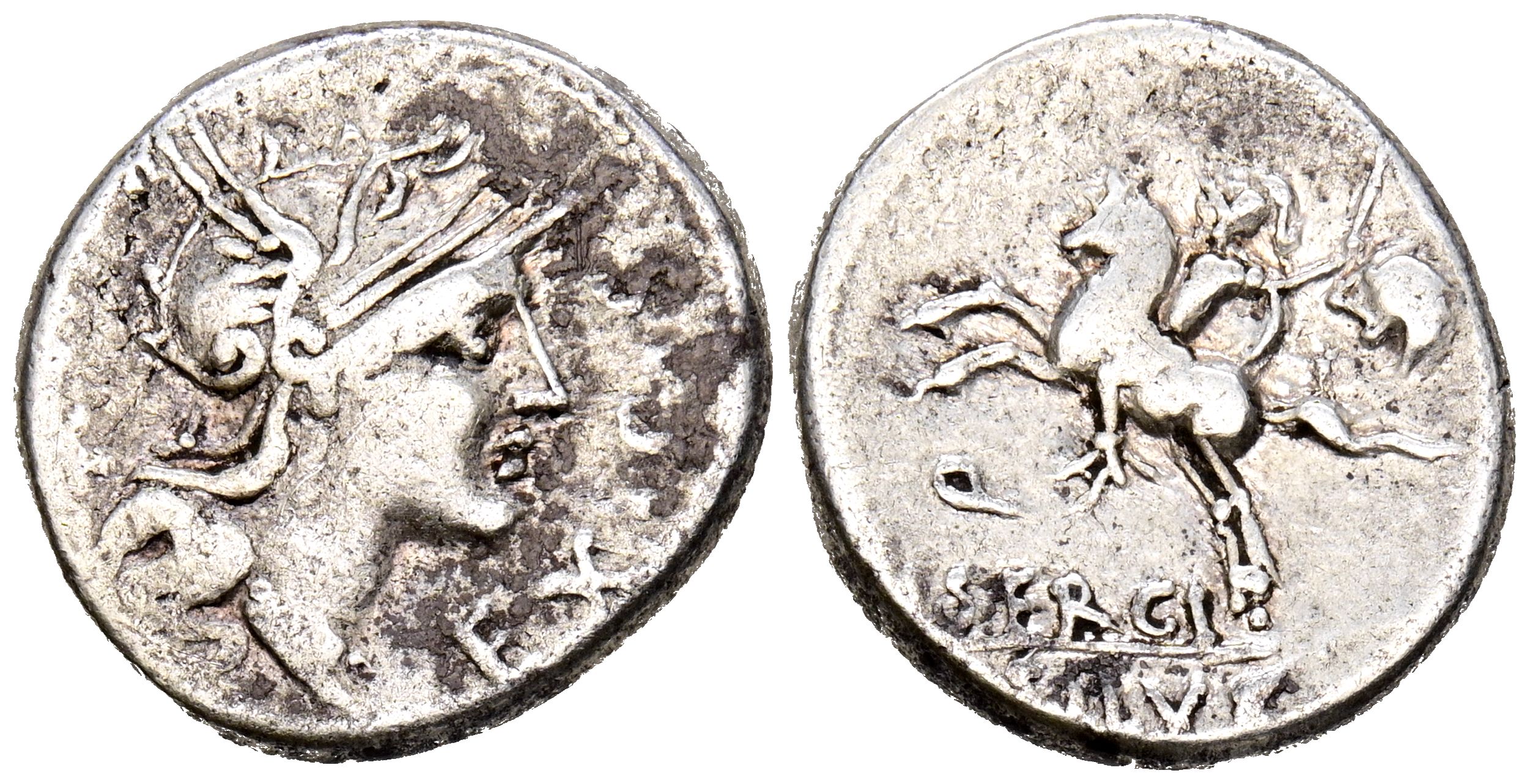 GENS SERGIA. Denario. (Ar. 3,88g/18mm). 116-115 a.C. Norte de Italia. (FFC 1111; Crawford 286/1). Anv: Cabeza de Roma a derecha, detrás estrella, detrás: ROMA, delante: EX SC. Rev: Jinete con espada a izquierda en el campo cabeza de galo, debajo Q y leyenda: M SERGI, en exergo: SILVS. MBC-.