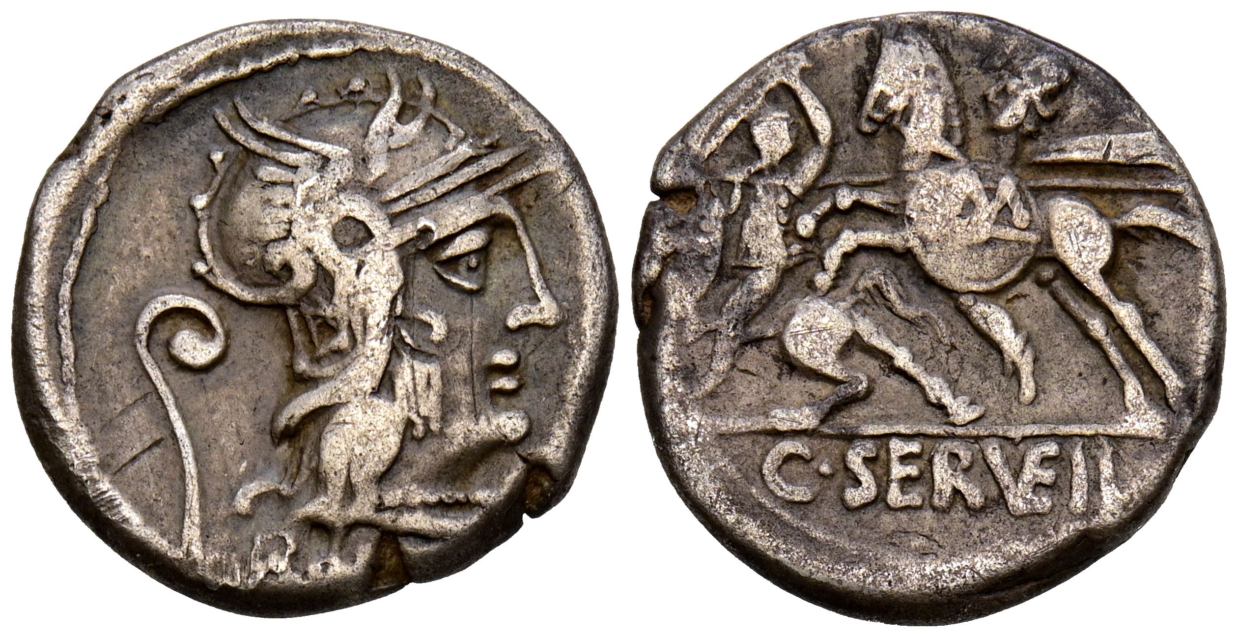 GENS SERVILIA. Denario. (Ar. 3,77g/18mm). 127 a.C. Roma. (FFC 1114; Crawford 264/1). Anv: Cabeza de Roma a derecha, delante estrella, detrás lituo, debajo leyenda: ROMA. Rev: Dos jinetes luchando a izquierda, en exergo: C SERVEIL. MBC-.