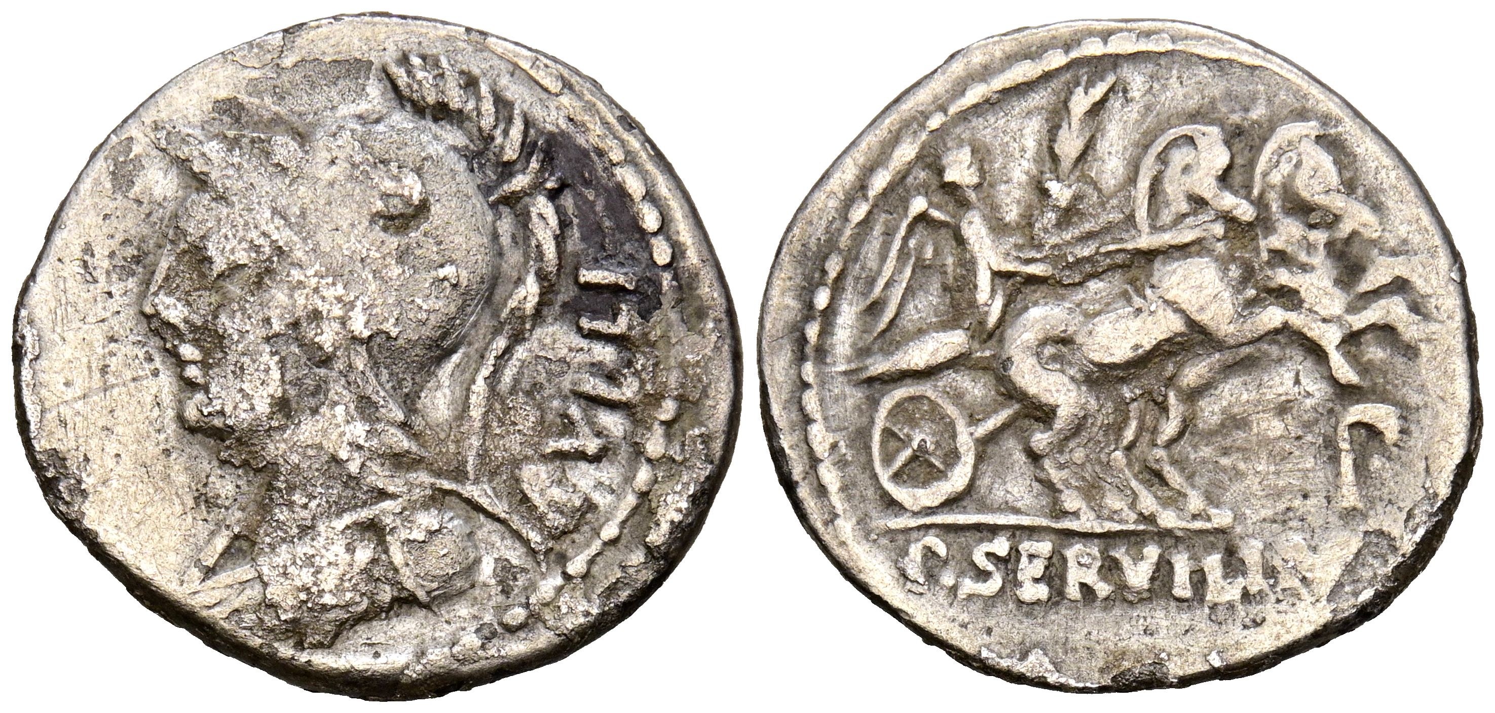 GENS SERVILIA. Denario. (Ar. 3,58g/20mm). Año 100 a.C. Norte de Italia. (FFC 1118; Crawford 328/1). Anv: Cabeza de Minerva a izquierda, detrás leyenda: RVLLI. Rev: Victoria con palma en biga a derecha, debajo letra, en exergo: P SERVILI M F. MBC-.