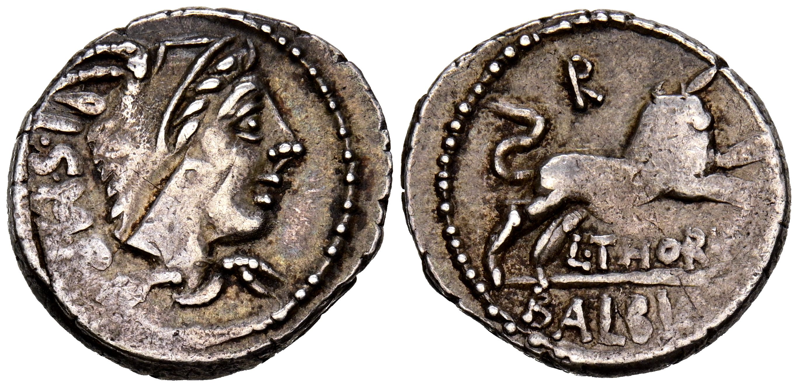 GENS THORIA. Denario. (Ar. 4,03g/19mm). 105 a.C. Norte de Italia. (FFC 1141; Crawford 316/1). Anv: Busto de Juno Sospita a derecha, cubierta con piel de cabra, detrás ISMR. Rev: Toro a derecha con las patas delanteras levantadas, encima: R, debajo leyenda: L THORIVS, en exergo: BALBVS. MBC. Vanos de acuñación.