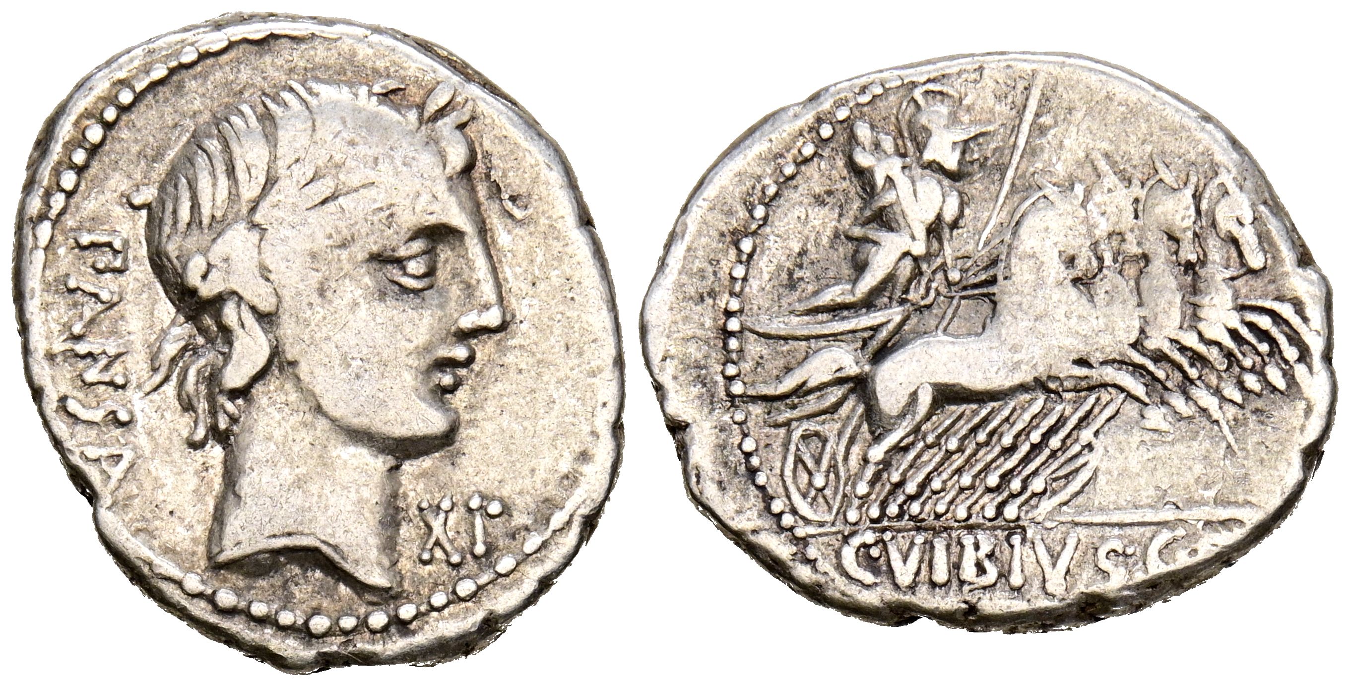 GENS VIBIA. Denario. (Ar. 3,80g/20mm). 90 a.C. Roma. (FFC 1201; Crawford 342/5b). Anv: Cabeza laureada de Apolo a la derecha, delante: XP, detrás leyenda: PANSA. Rev: Minerva conduciendo el carro a la derecha con cetro y trofeo, exergo: C VIBIVS CF. MBC.