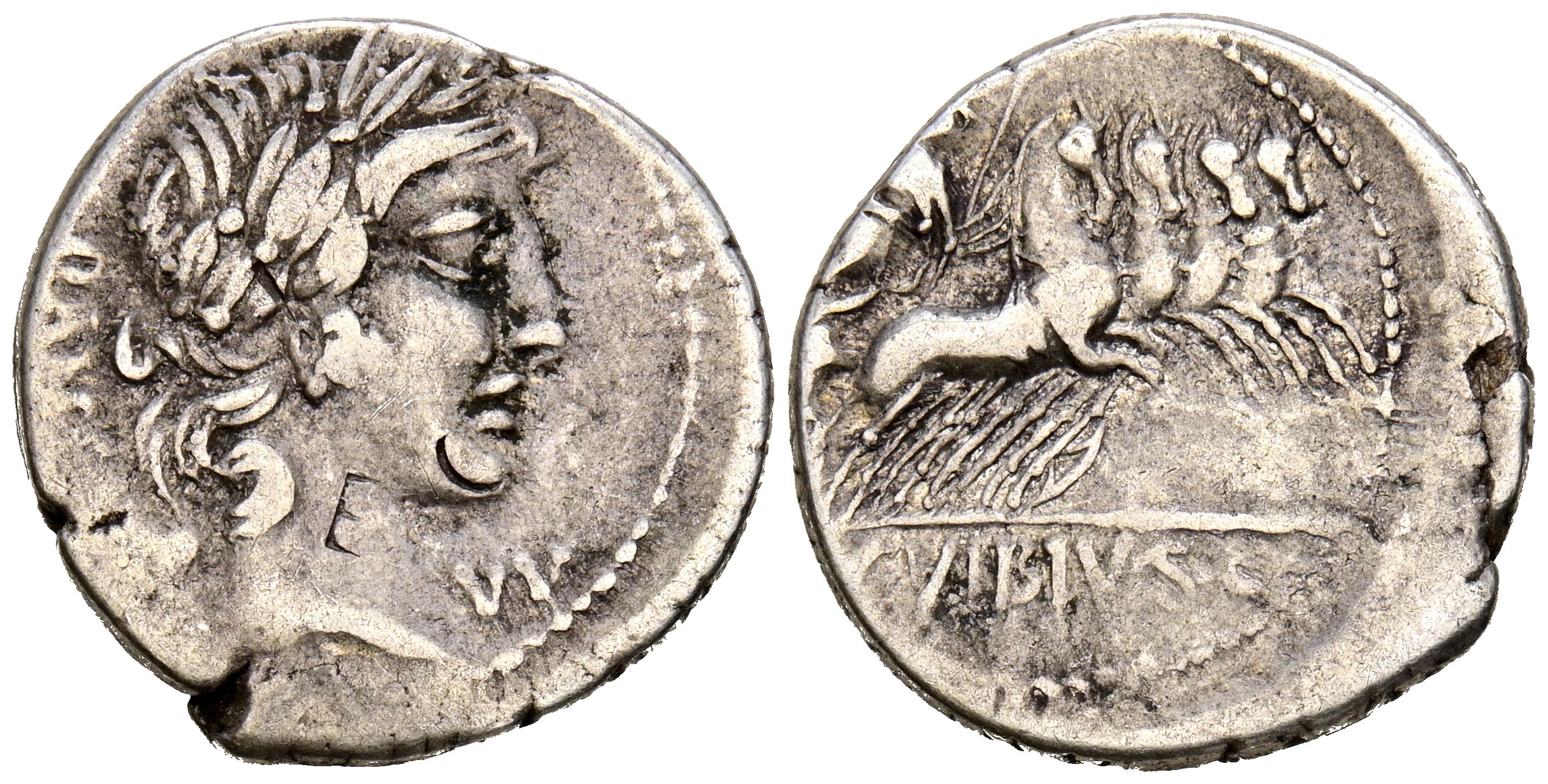 GENS VIBIA. Denario. (Ar. 3,81g/20mm). 90 a.C. Roma. (FFC 1201; Crawford 342/5b). Anv: Cabeza laureada de Apolo a la derecha, delante: VV, detrás leyenda: PANSA. Rev: Minerva conduciendo el carro a la derecha con cetro y trofeo, exergo: C VIBIVS CF. MBC.