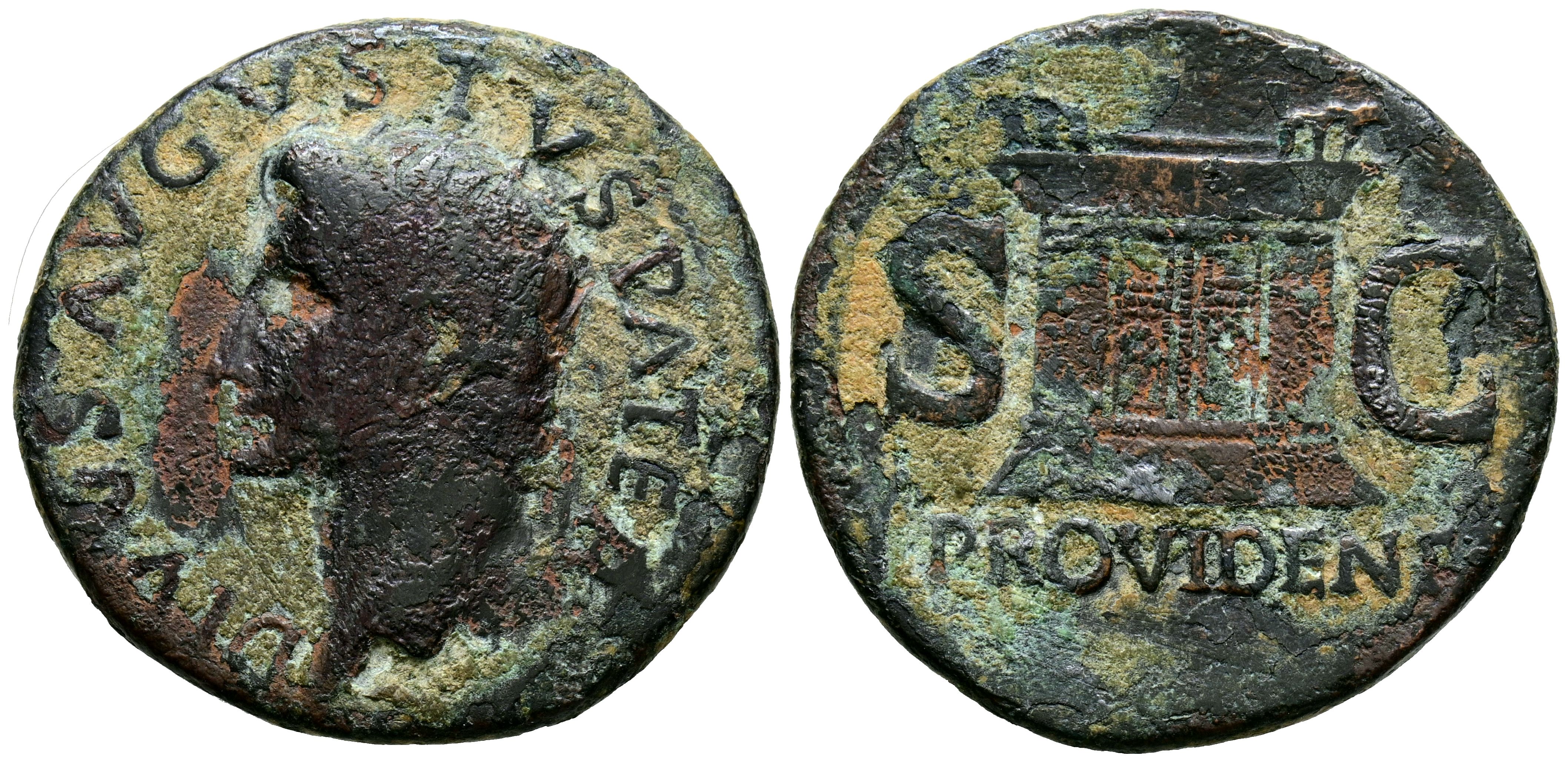 DIVO AUGUSTO. As. (Ae. 10,28g/29mm). 22-30 d.C. Roma. (RIC 81). Anv: Cabeza radiada de Augusto a izquierda, alrededor leyenda: DIVVS AVGVSTVS PATER. Rev: Altar cerrado por dos puertas, entre S-C, debajo: PROVIDENT. MBC-. Limpiado.