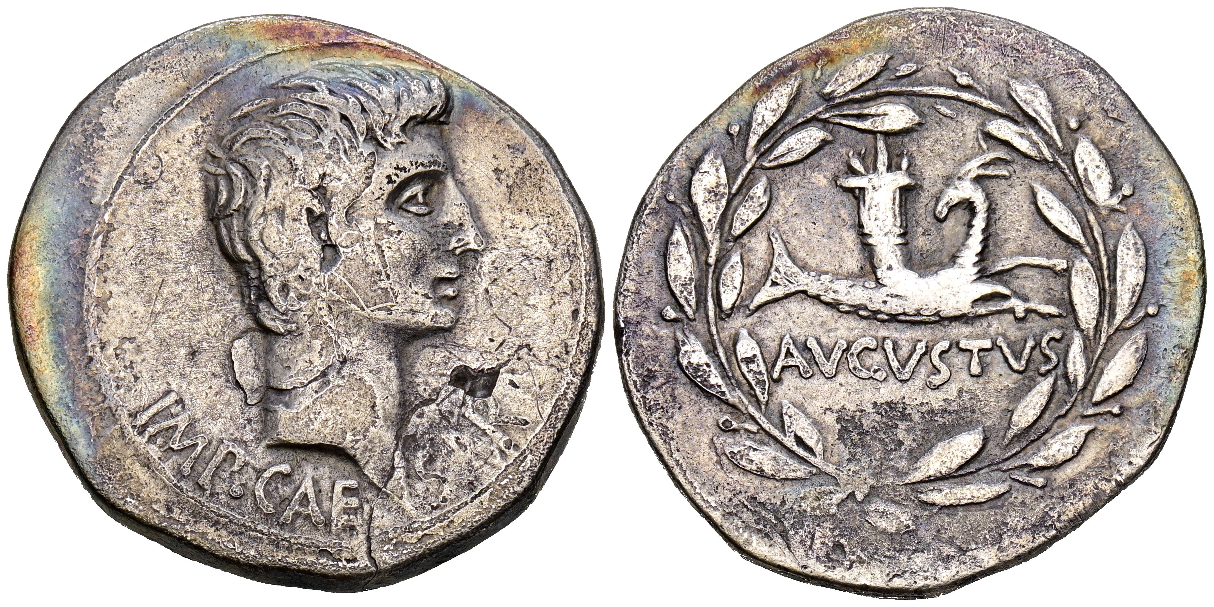 AUGUSTO. Cistóforo. (Ar. 11,62g/28mm). 25-20 a.C. Efesos, Asia menor. (RPC 2213; RIC 477). Anv: Cabeza de Augusto a derecha, debajo leyenda: IMP CAESAR. Rev: Capricornio a derecha mirnaod a izquierda, detrás cornucopia, debajo: AVGVSTVS, todo dentro de corona de laurel. MBC-. Escaso ejemplar.